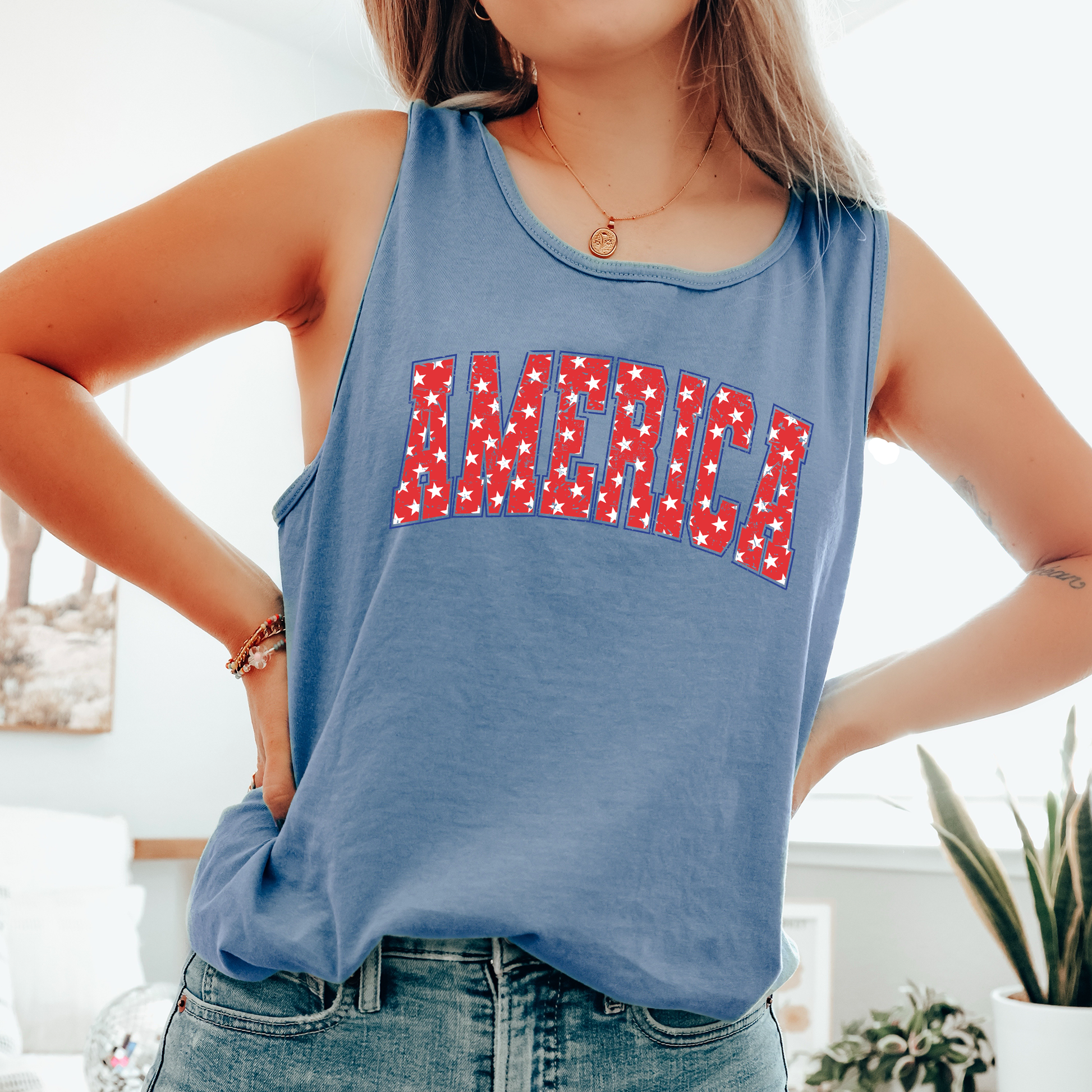 Whether you're cheering on your favorite team, hosting a picnic, or enjoying a day at the beach, the America Retro Varsity Tank Top is the ideal choice for showcasing your patriotic flair. Don't let this opportunity pass you by— make this tank top a staple in your summer wardrobe today!