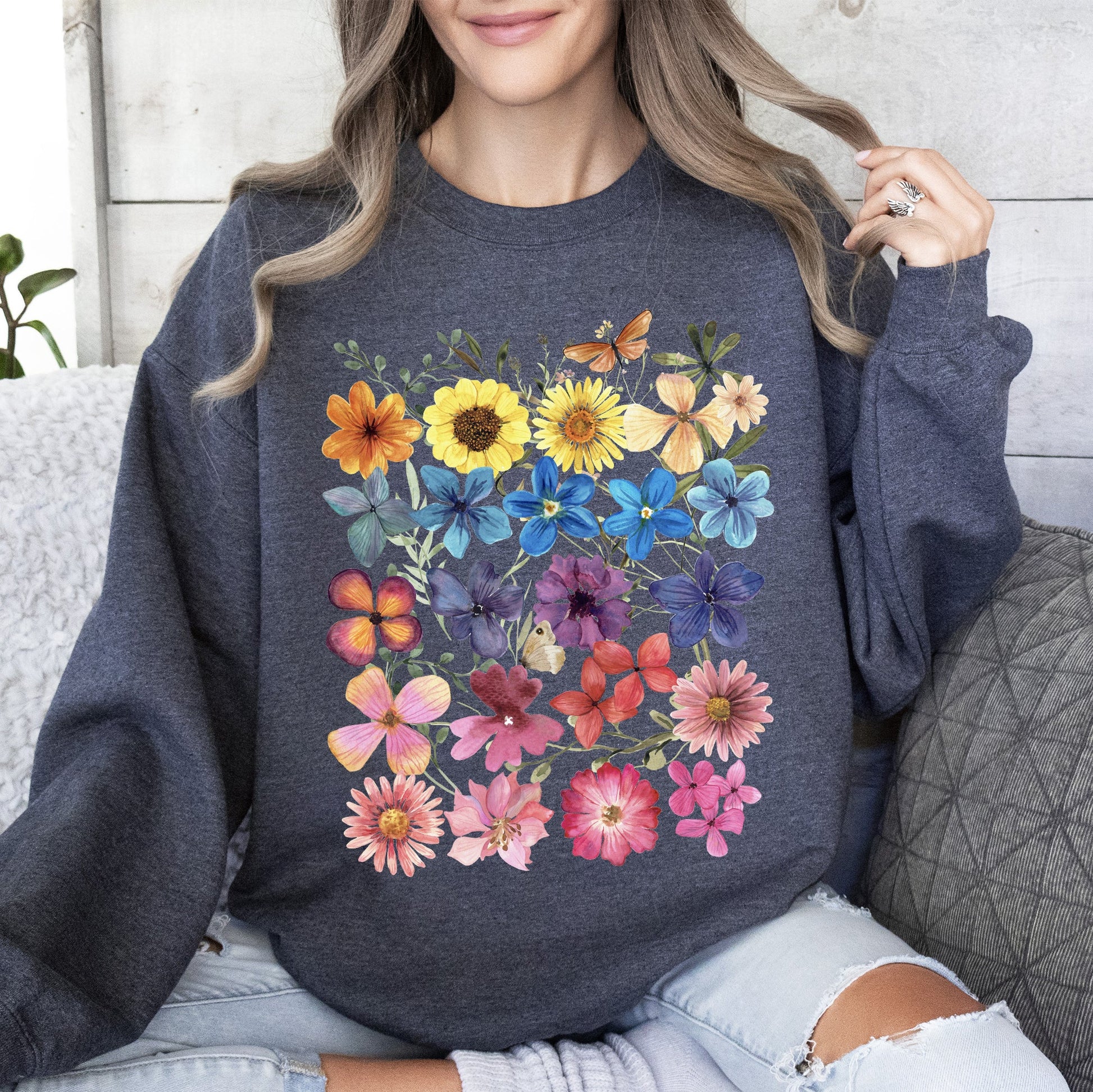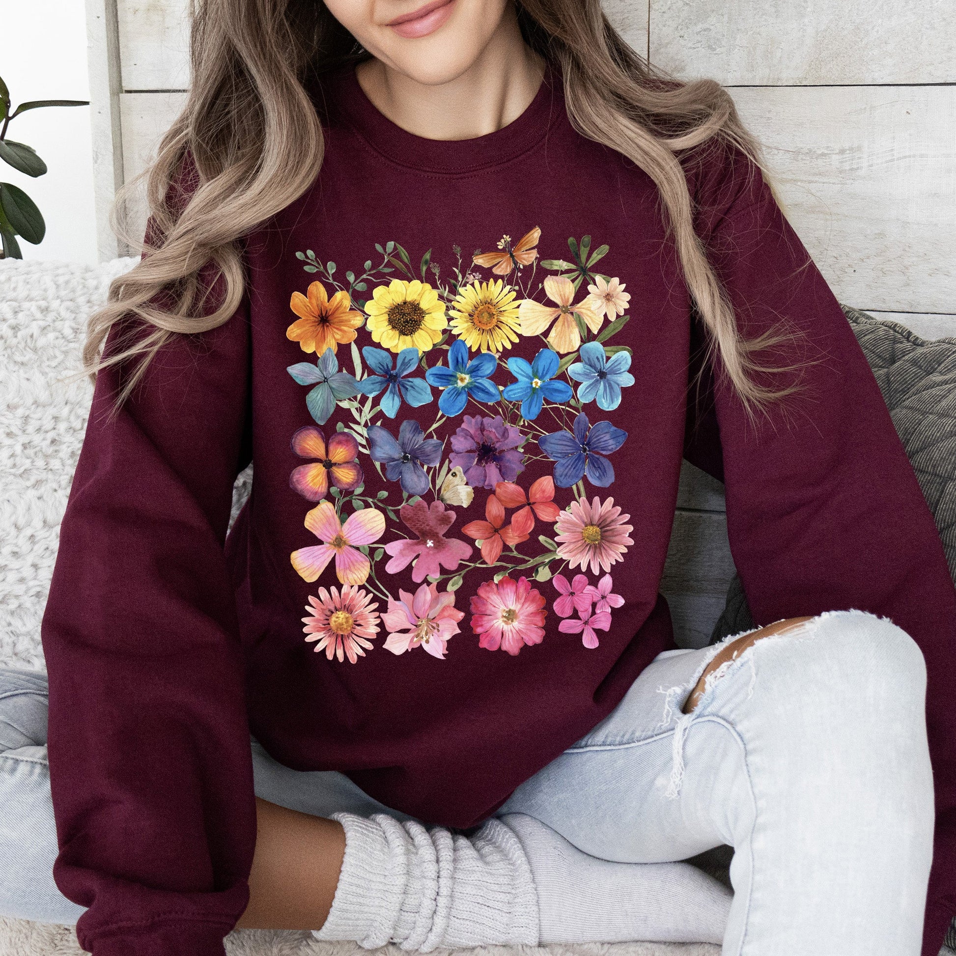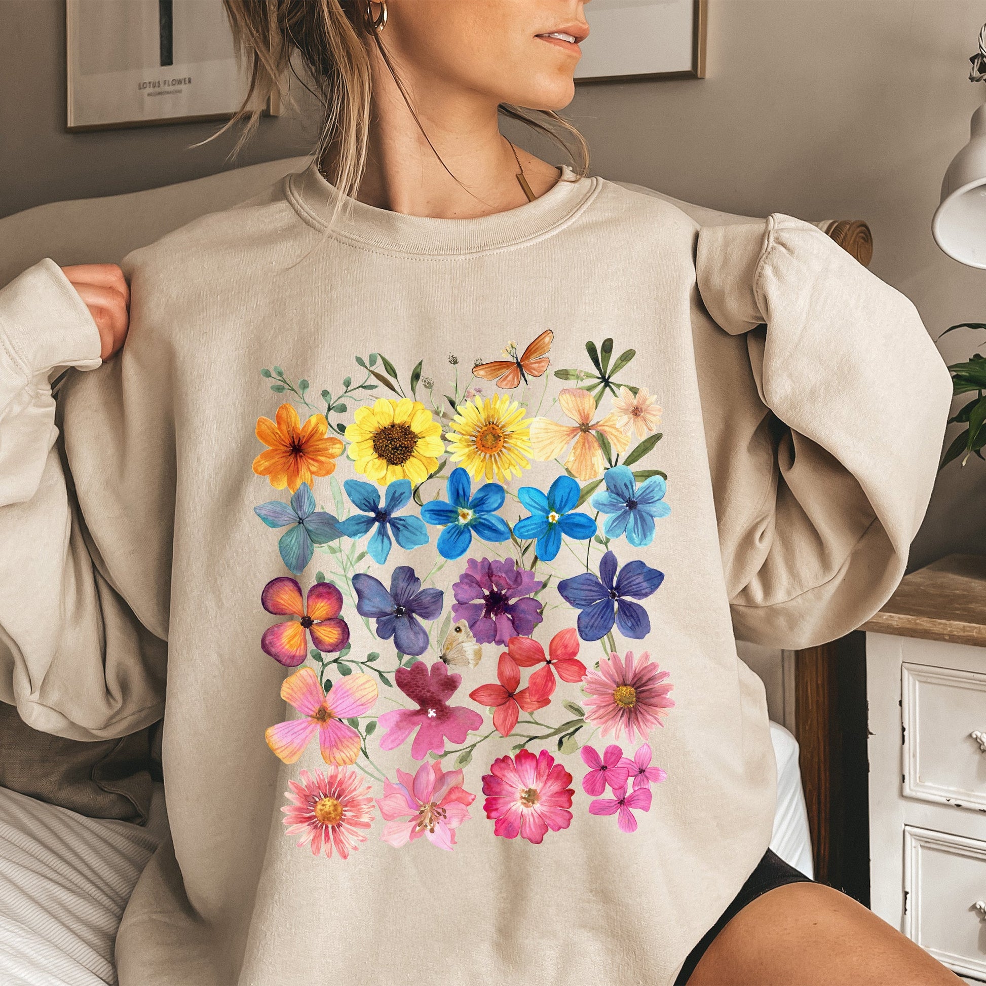 The Bright Pressed Flowers Sweatshirt pairs wonderfully with jeans for a laid-back yet stylish look. Layer it over a shirt for extra warmth and flair, making it ideal for both casual outings and cozy nights in. Elevate your wardrobe with this charming sweatshirt that brings the essence of nature into your everyday style!
