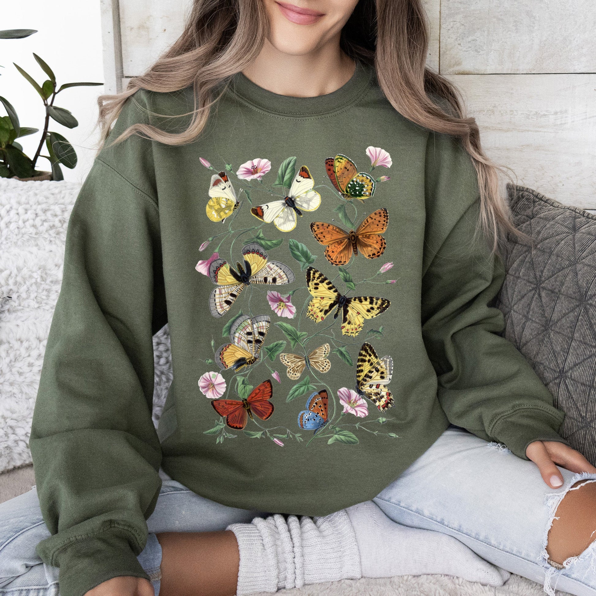 The Butterfly Garden, Vibrant Floral and Butterfly Print Sweatshirt pairs excellently with jeans for a relaxed yet trendy look, or can be layered over a chic top for added style. Perfect for casual outings, cozy nights in, or simply expressing your love for nature’s beauty.