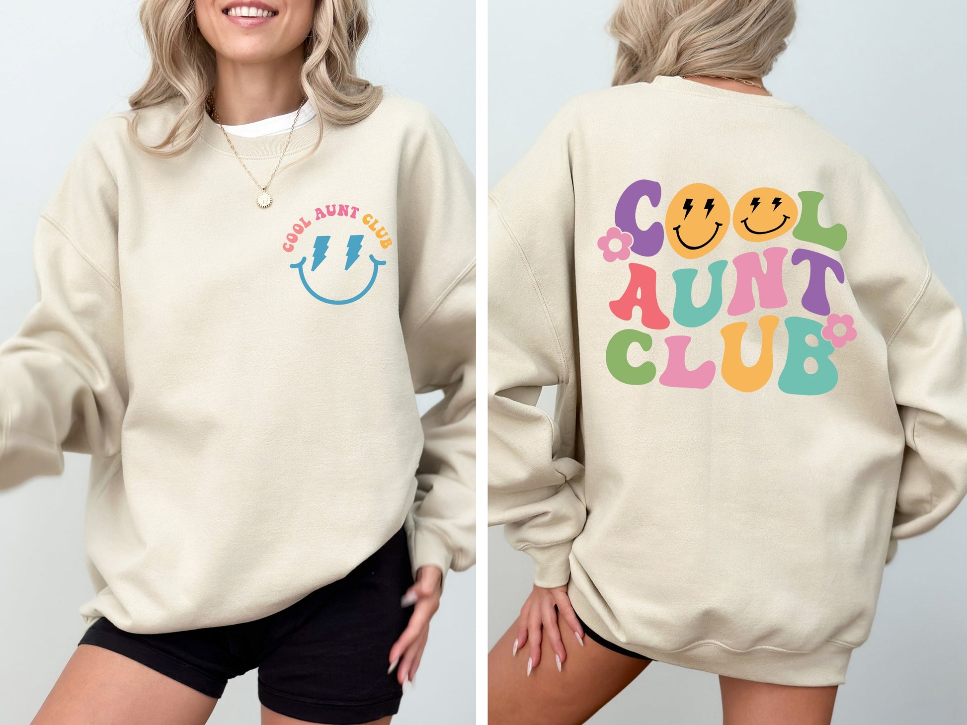 Introducing the Cool Aunt Club Front And Back Print Sweatshirt, your new favorite cozy companion! This stylish sweatshirt seamlessly blends comfort with a playful design, making it the perfect addition to your casual wardrobe. Whether you're lounging at home or heading out with friends, this sweatshirt ensures you look great while feeling even better.