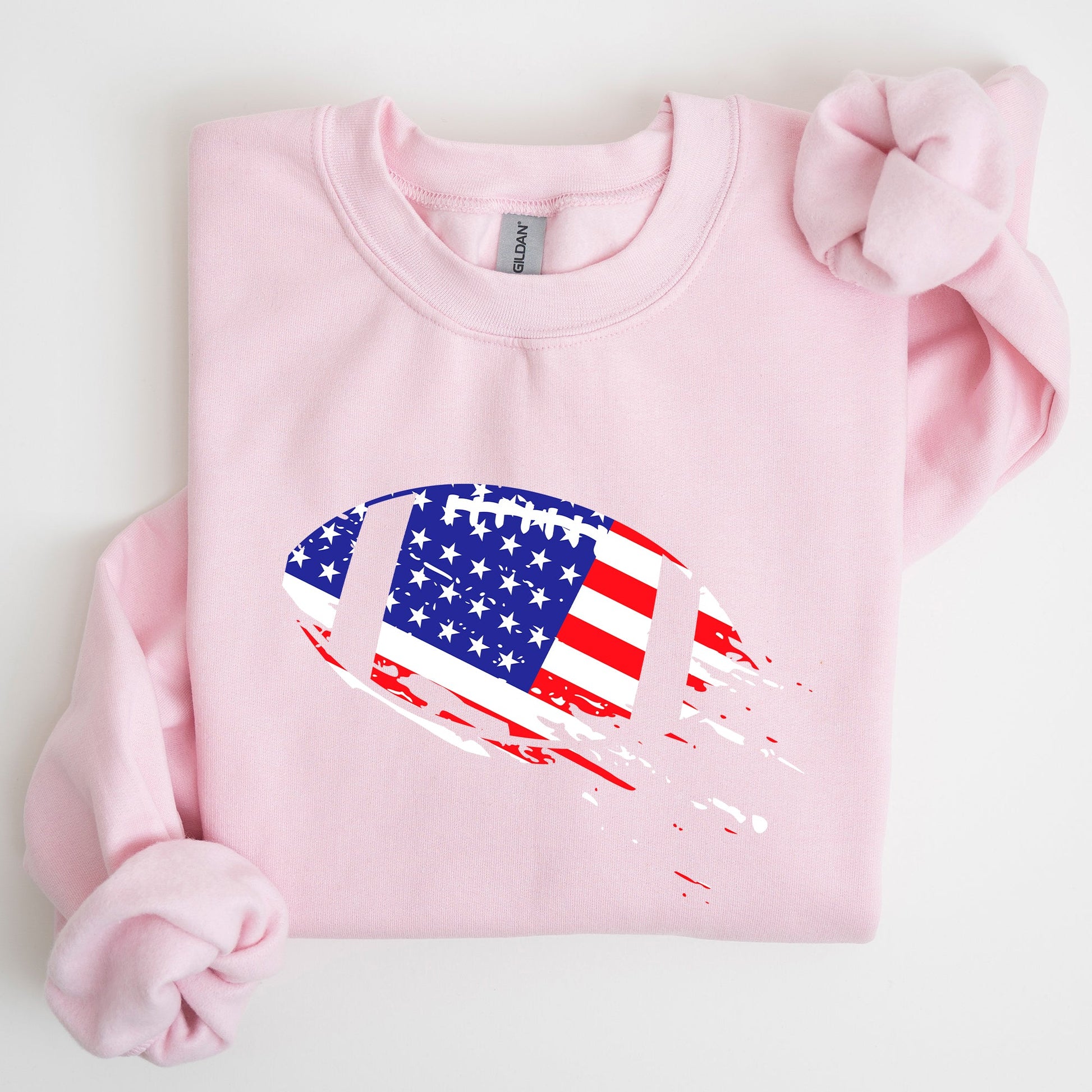 This Football, Sports, American Flag, Patriotic, Sweatshirt pairs perfectly with jeans for a laid-back, yet trendy look. It can also be layered over shirts for added style, making it a versatile addition to your wardrobe. Whether you're heading to a game or enjoying a casual night in, this sweatshirt is your go-to choice for comfort and style.