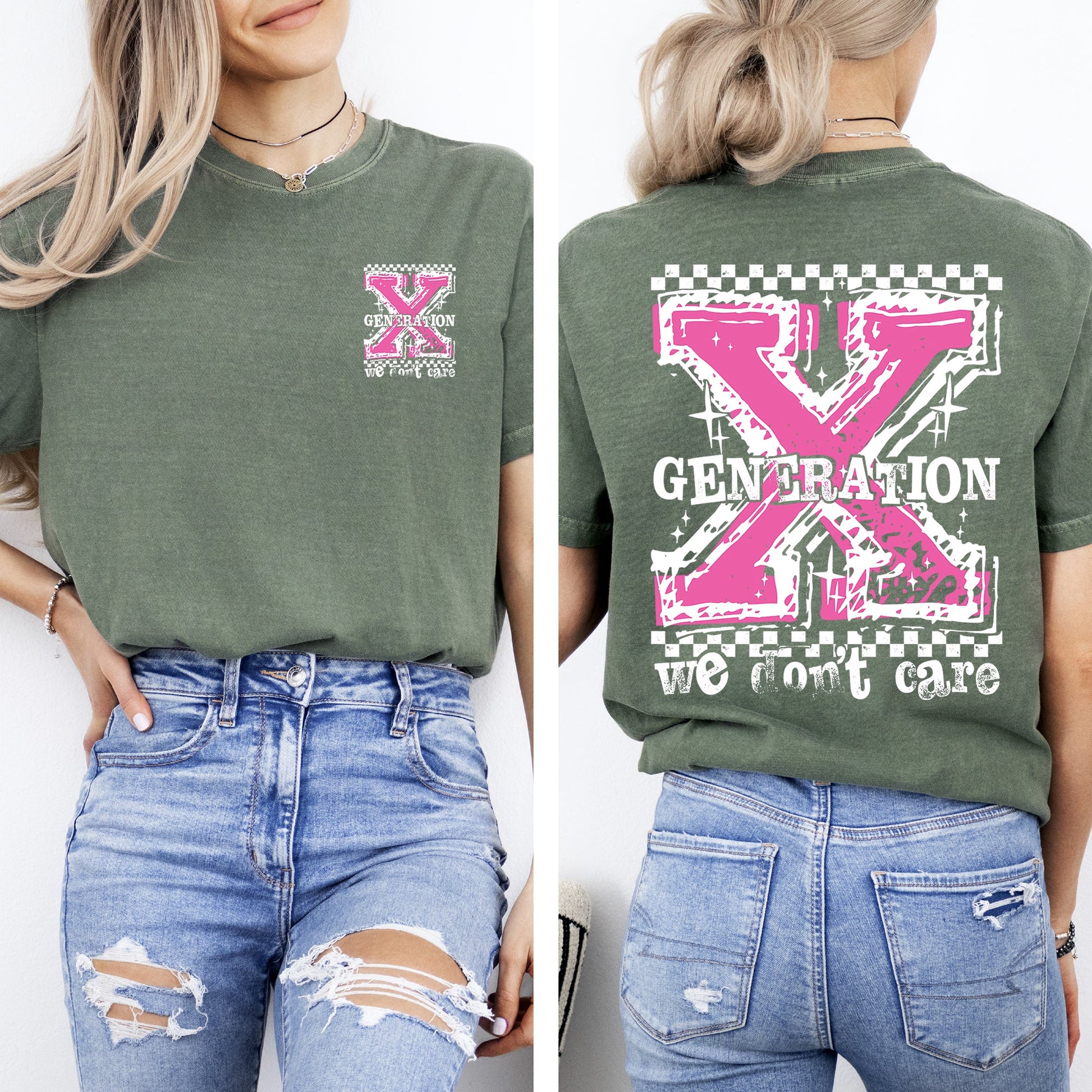 Transform your wardrobe with the Gen X, We Don't Care, Generation X, Funny, Sassy, Front and Back, Comfort Colors T-Shirt. It's time to wear your attitude with confidence and charm. Don't miss out—order yours today and let your style do the talking!