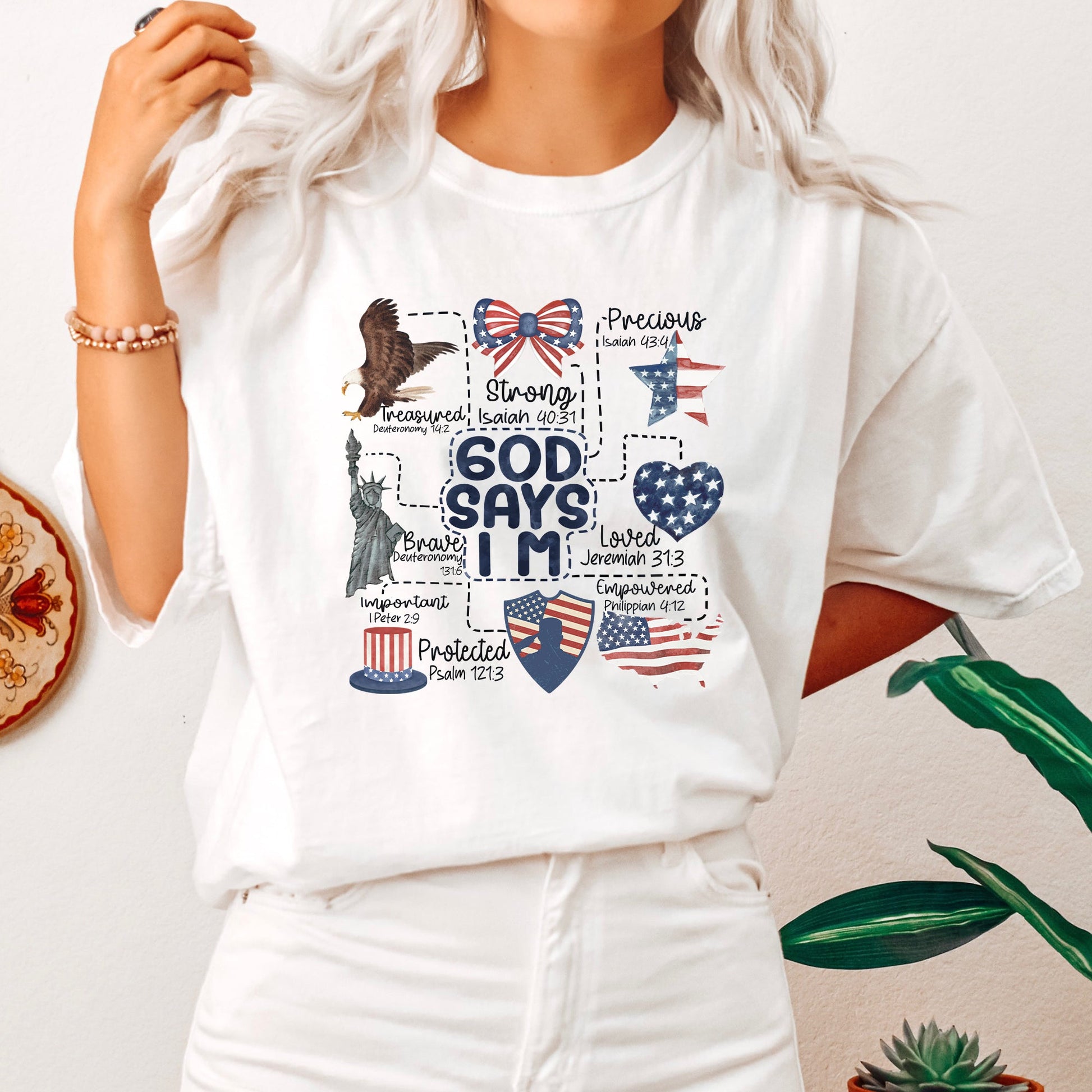 Embrace your strength and patriotism with our God Says I Am Comfort Colors T-shirt. This exceptional tee combines a classic style with modern comfort, making it an essential piece for those who value both fashion and a powerful message. Crafted from high-quality materials, this shirt offers a unique vintage aesthetic while ensuring all-day comfort.