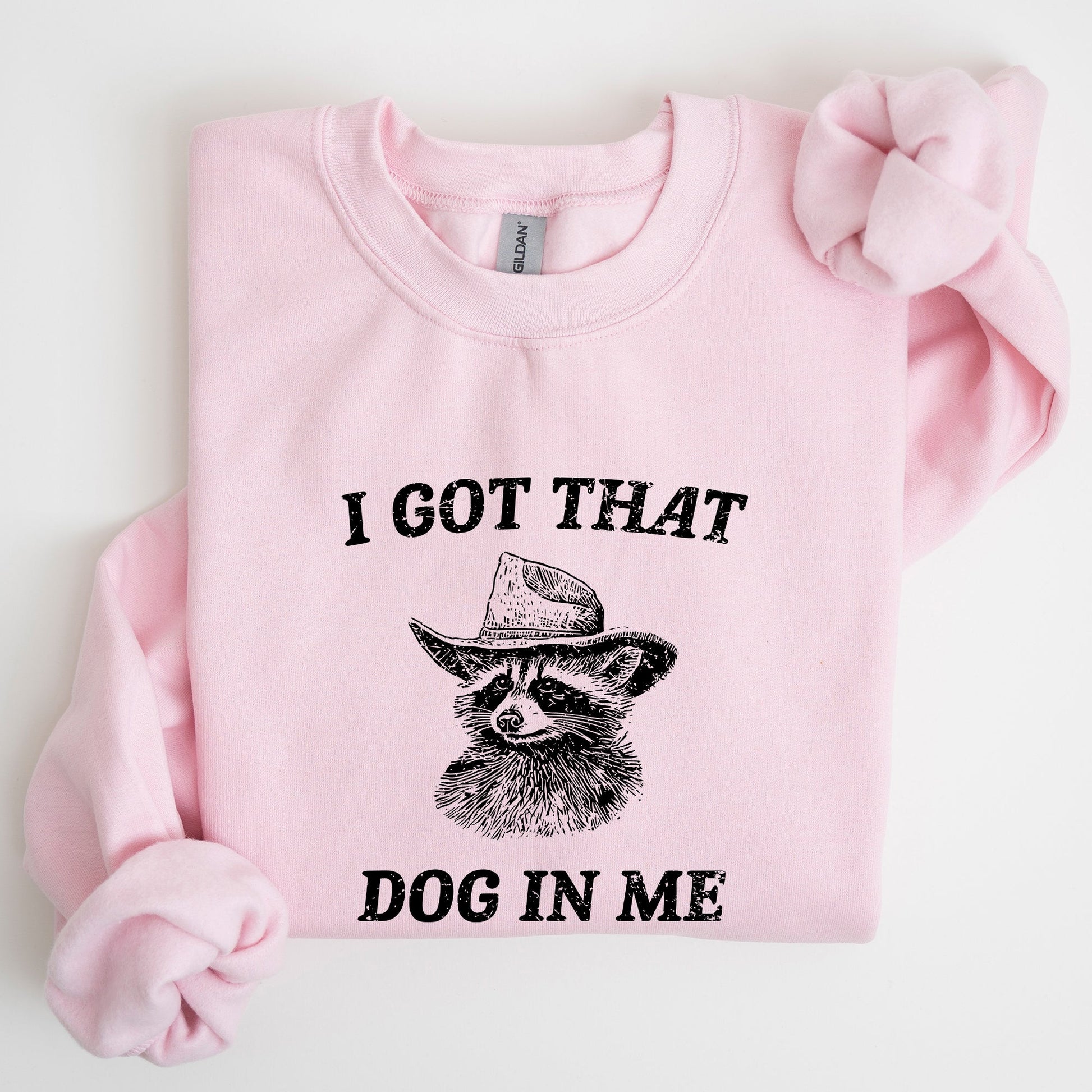 Step into comfort and creativity with our I Got That Dog In Me, Raccoon, Meme, Aesthetic, Funny Sweatshirt. This sweatshirt is more than just a cozy garment; it's a statement piece that expresses your unique personality while keeping you warm. Its playful design captures the essence of internet culture, combining humor and style that resonates with meme lovers and aesthetic enthusiasts alike.