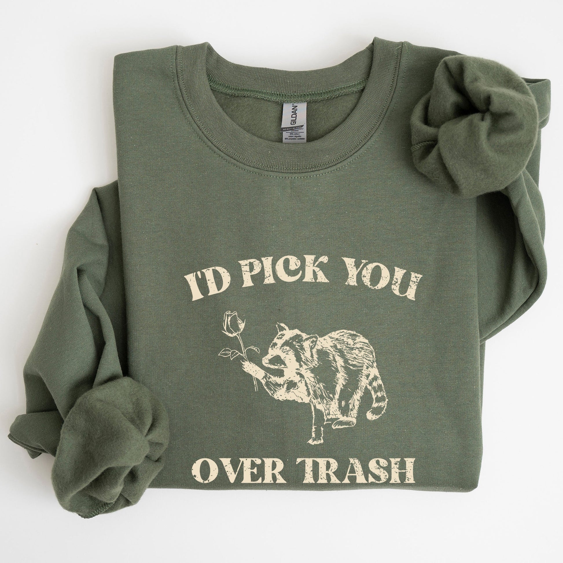 Introducing the I'd Pick You Over Trash, Raccoon, Meme, Aesthetic, Funny Sweatshirt—a perfect blend of comfort and humor that elevates your casual wardrobe! This delightful sweatshirt is not just a clothing item; it's a statement piece that showcases your fun-loving personality and unique sense of style. Designed with a whimsical raccoon graphic, this sweatshirt brings a touch of laughter to your everyday look.