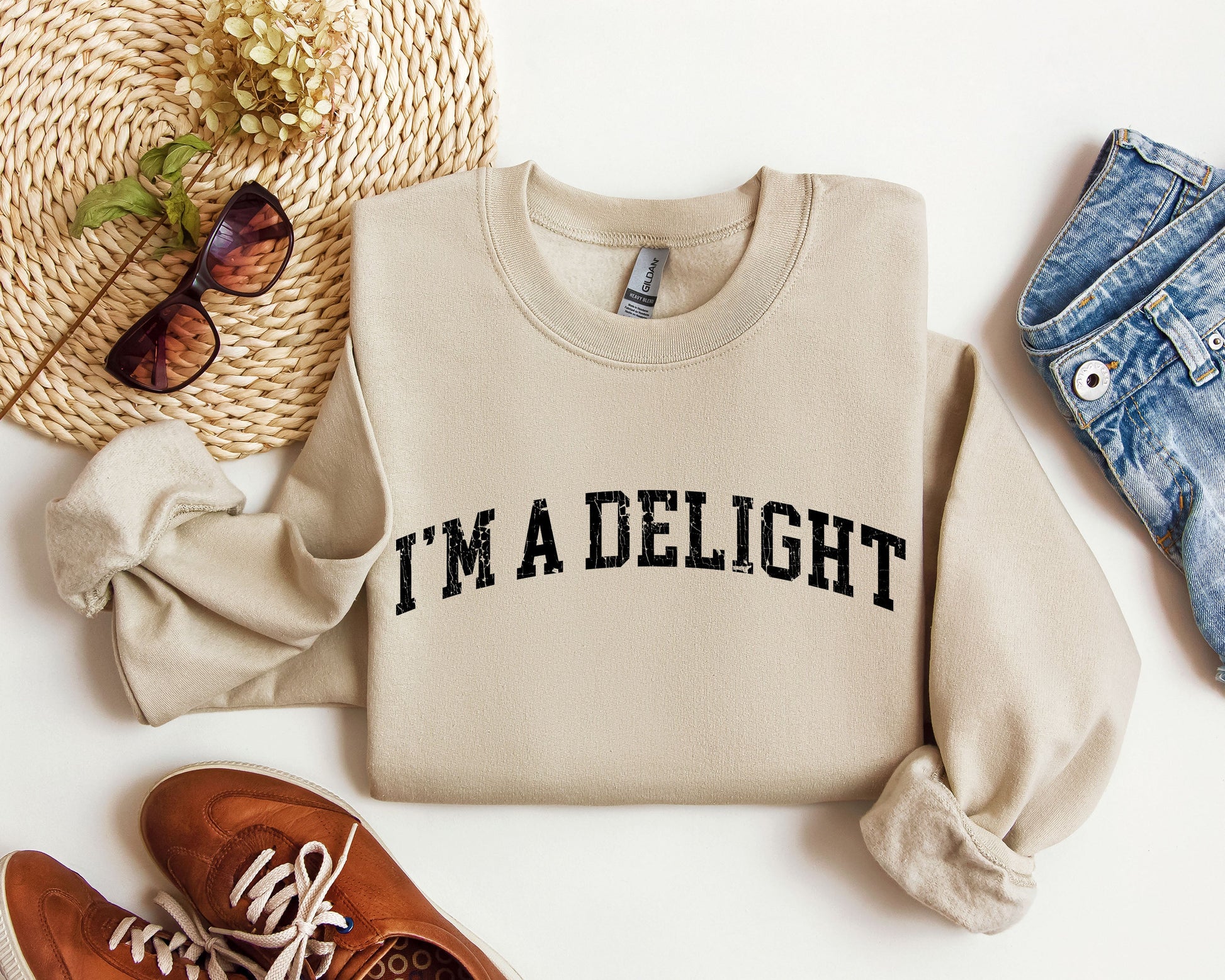 The I'm A Delight Funny Sweatshirt pairs effortlessly with jeans for a laid-back yet trendy look or can be layered over your favorite shirts for an added style punch. It's the ideal choice for casual outings or cozy nights in, making it a versatile addition to your wardrobe. Elevate your style and express your personality with this delightful sweatshirt!
