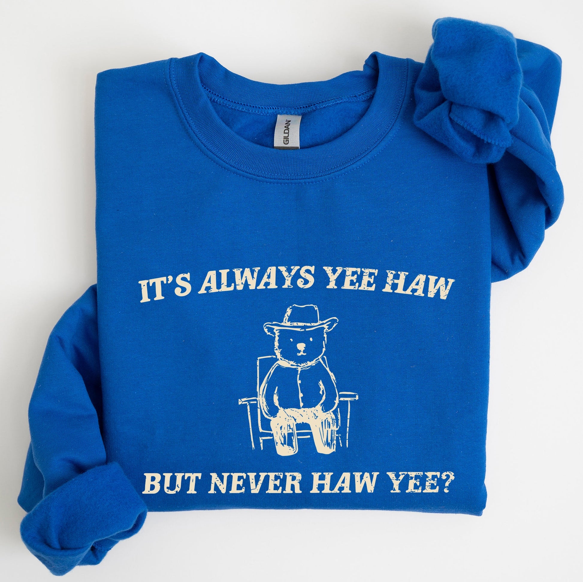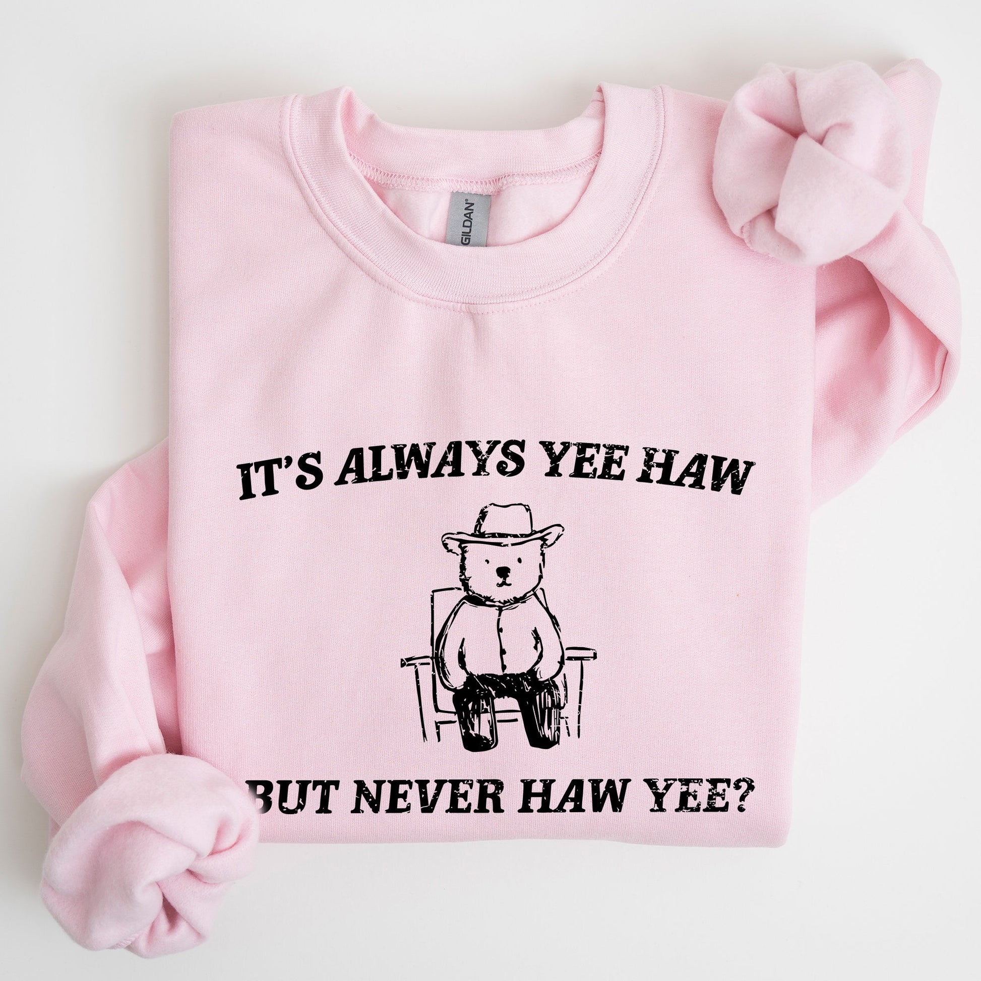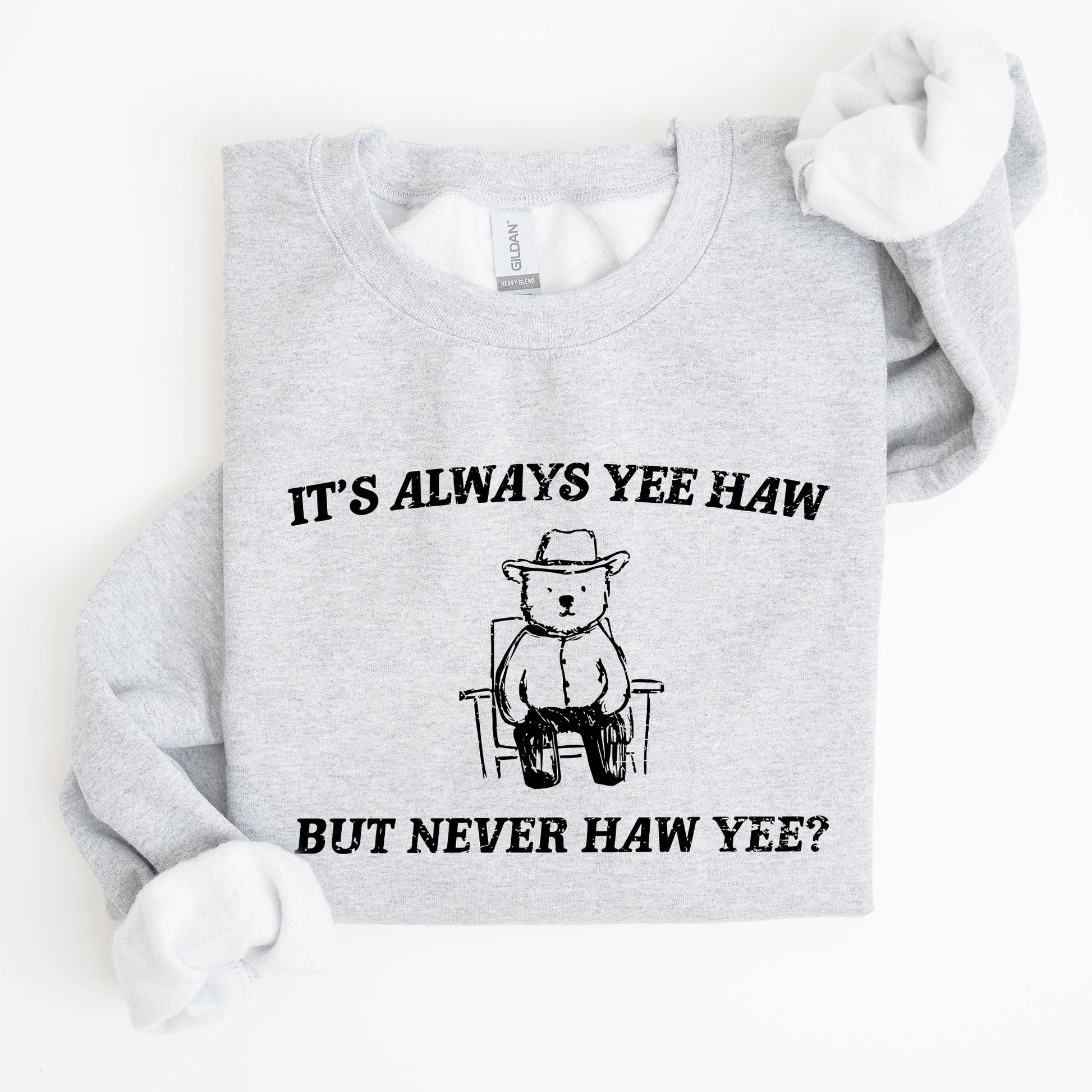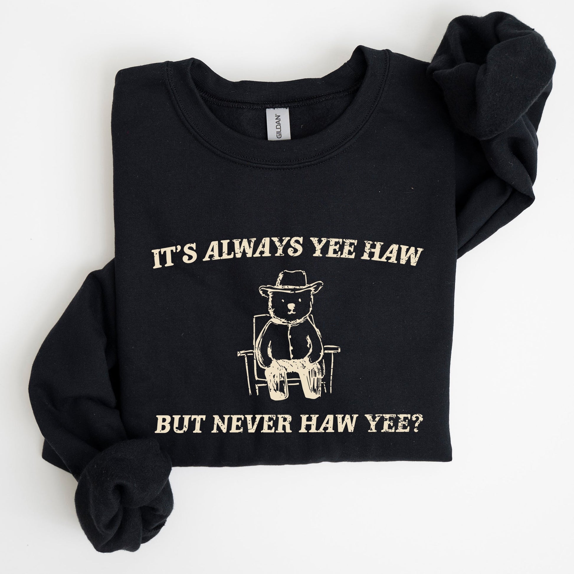 This It's Always Yee Haw, Bear, Meme, Aesthetic, Funny Sweatshirt pairs effortlessly with jeans for a laid-back look or can be layered over your favorite shirts for added style. Perfect for casual outings, cozy nights in, or just lounging around, this sweatshirt is a must-have addition to your wardrobe.