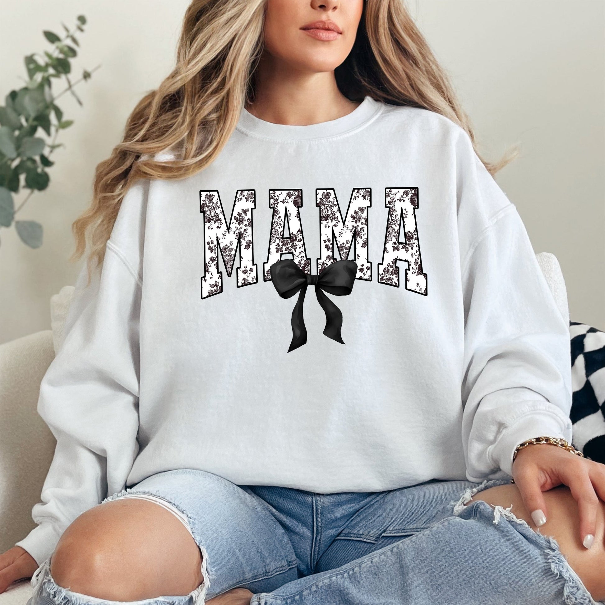 This stylish sweatshirt pairs effortlessly with jeans for a casual yet trendy look. For added flair, layer it over your favorite shirt. Whether you're enjoying a cozy night in or heading out for a casual outing, the Mama, Bow, Ribbon, Black, Chinoiserie, Coquette, Varsity, Mother's Day Sweatshirt is perfect for showcasing your personality while celebrating motherhood.