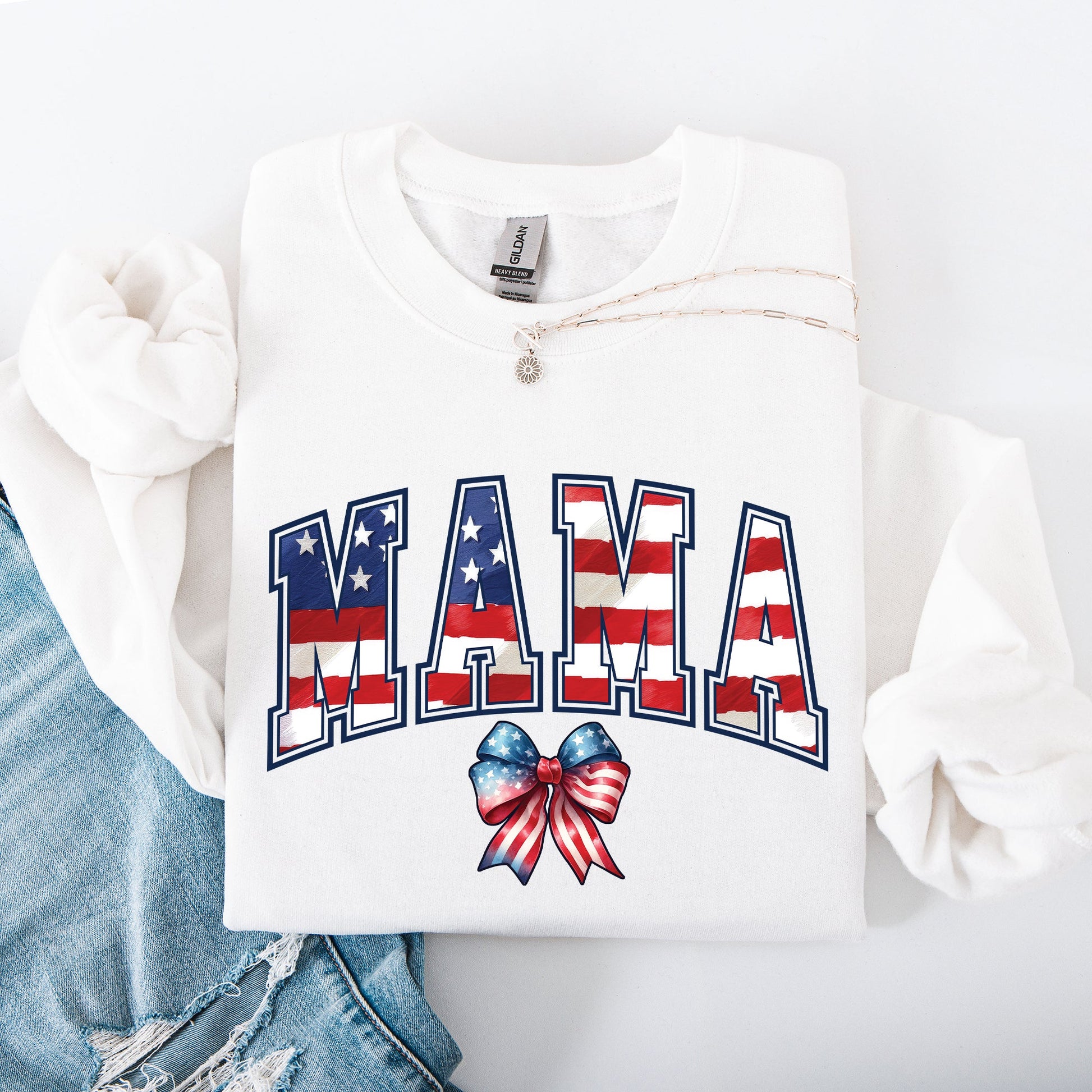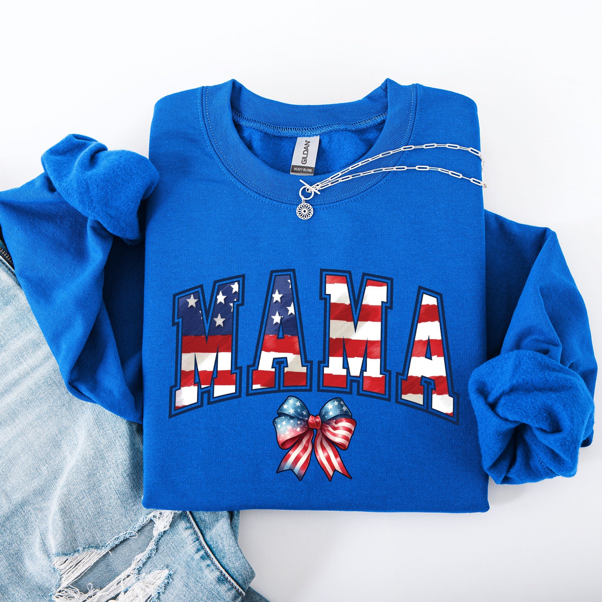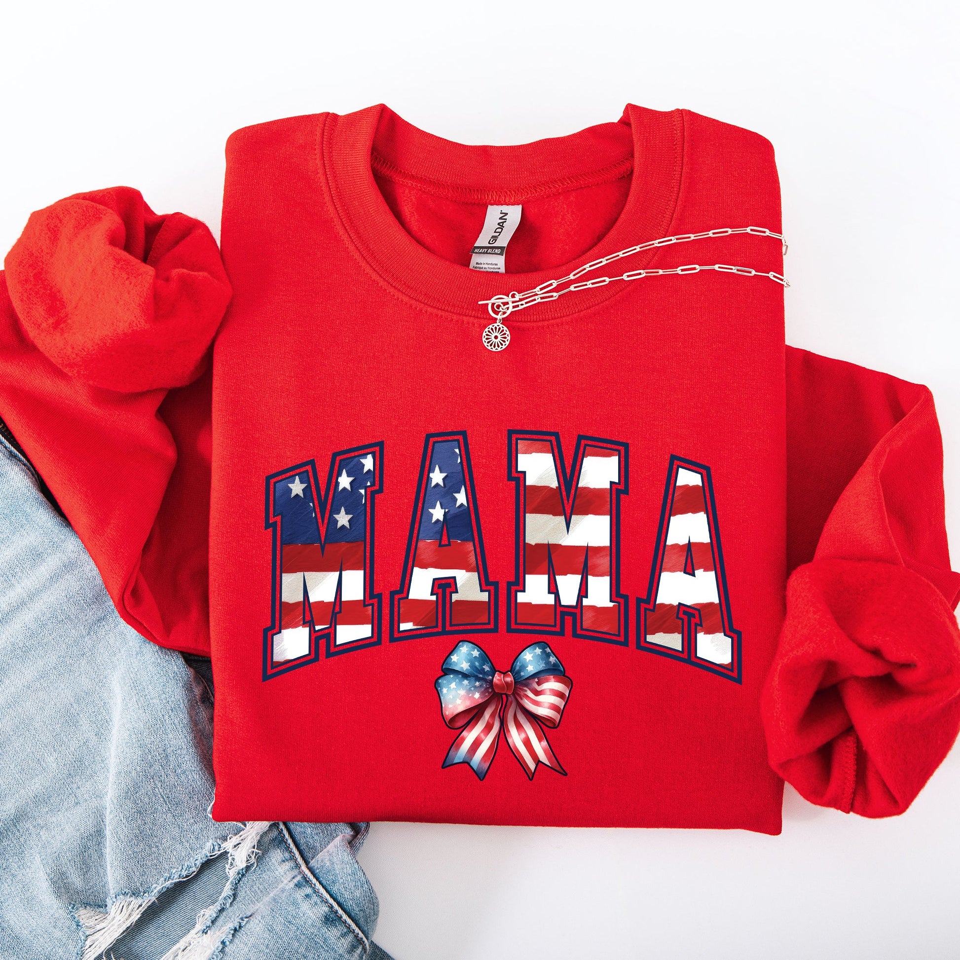 Mama, USA Flag, Patriotic, Varsity, Bow, Ribbon, America, 4th of July Sweatshirt