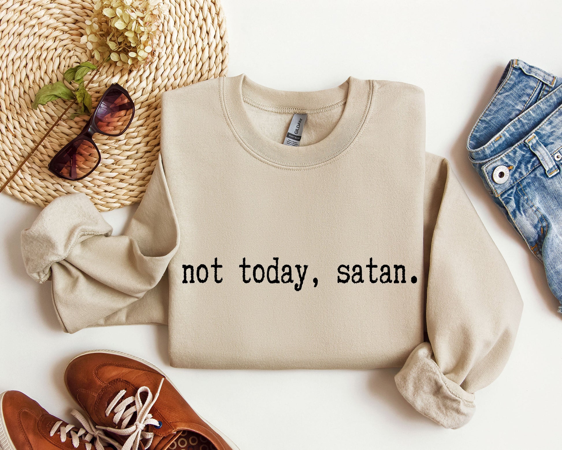 This Not Today Satan Funny Sweatshirt, Sarcastic College Sweatshirt pairs effortlessly with jeans for a casual outing or can be layered over a collared shirt for a trendy, preppy look. Perfect for both casual hangouts and cozy nights in, this sweatshirt is a must-have addition to your wardrobe.