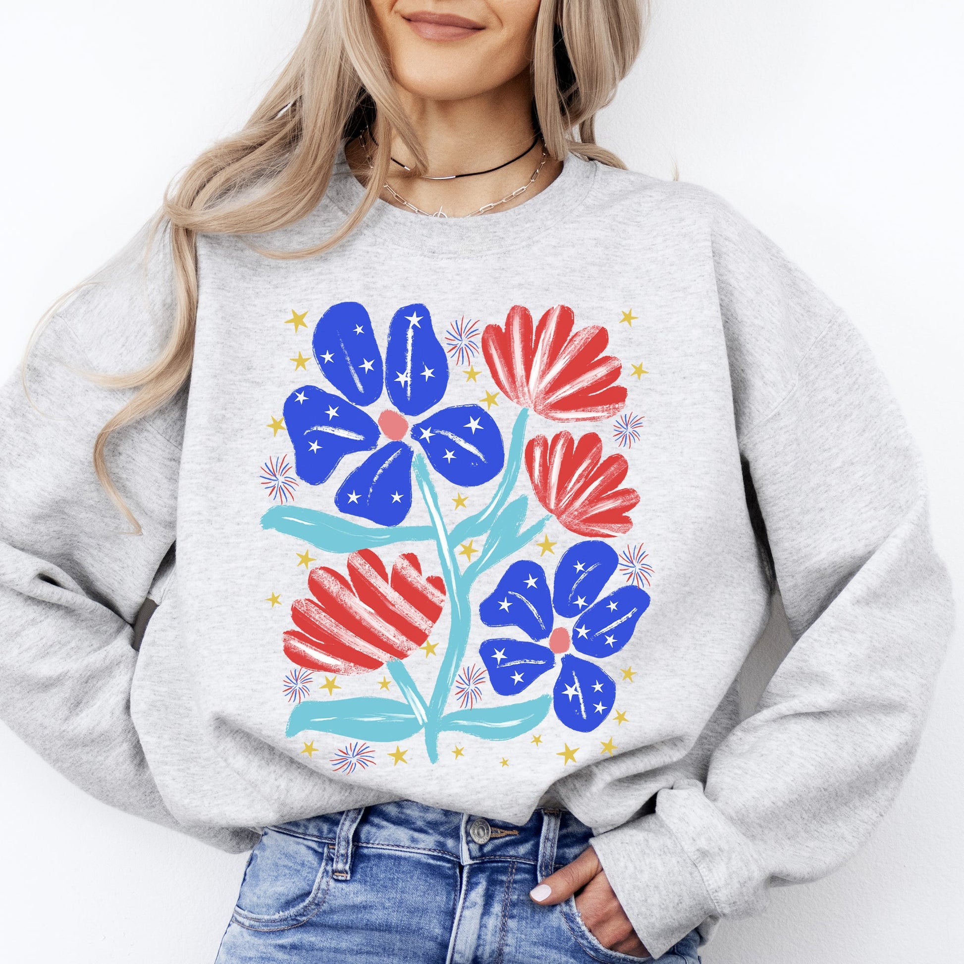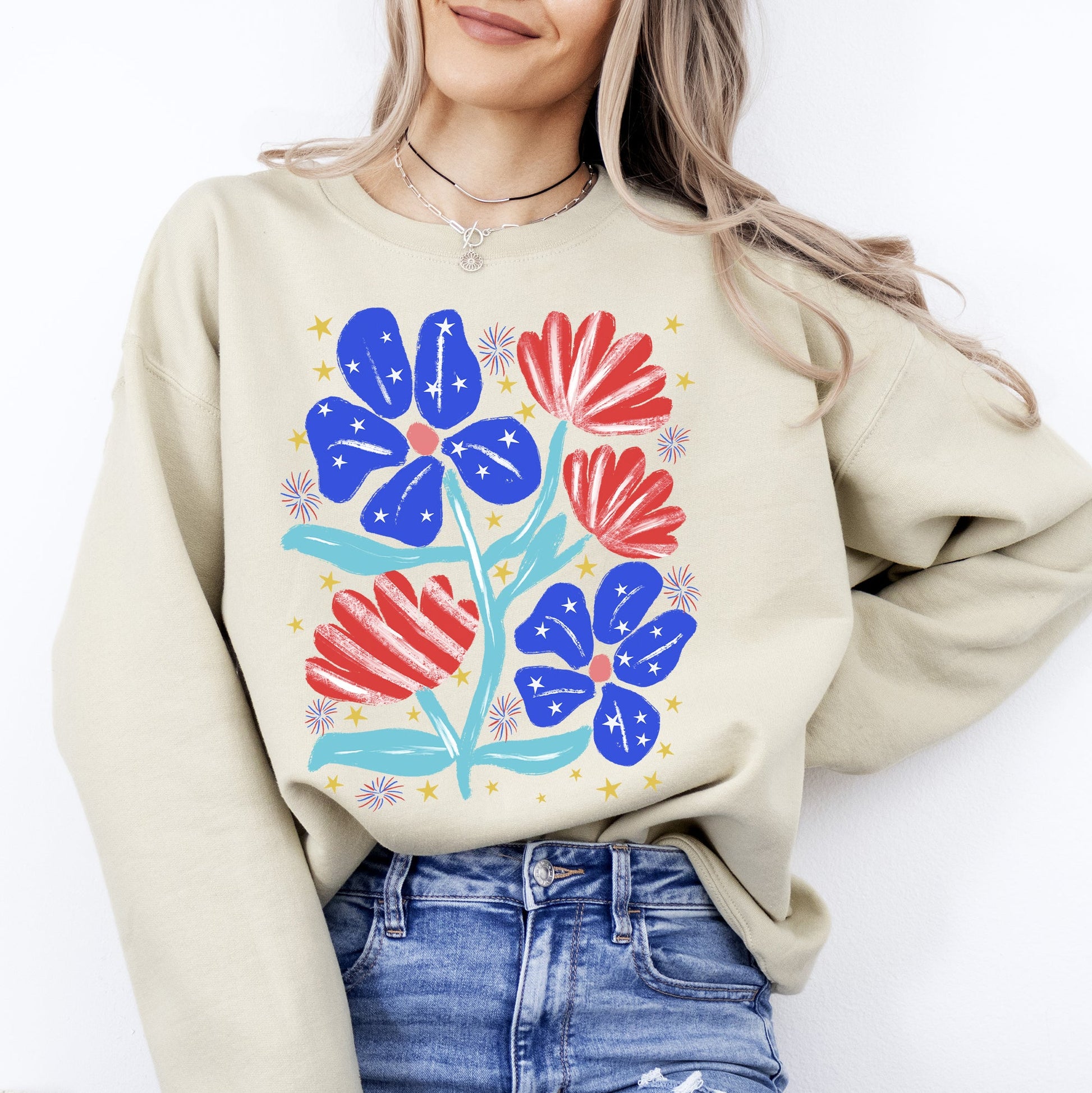 This Patriotic Flowers, Red White Blue, America, USA, 4th of July Sweatshirt pairs perfectly with your favorite jeans for a relaxed yet trendy look. It can also be layered over shirts for added style, making it ideal for both casual outings and cozy nights in. Show off your love for the USA in comfort and style this 4th of July!