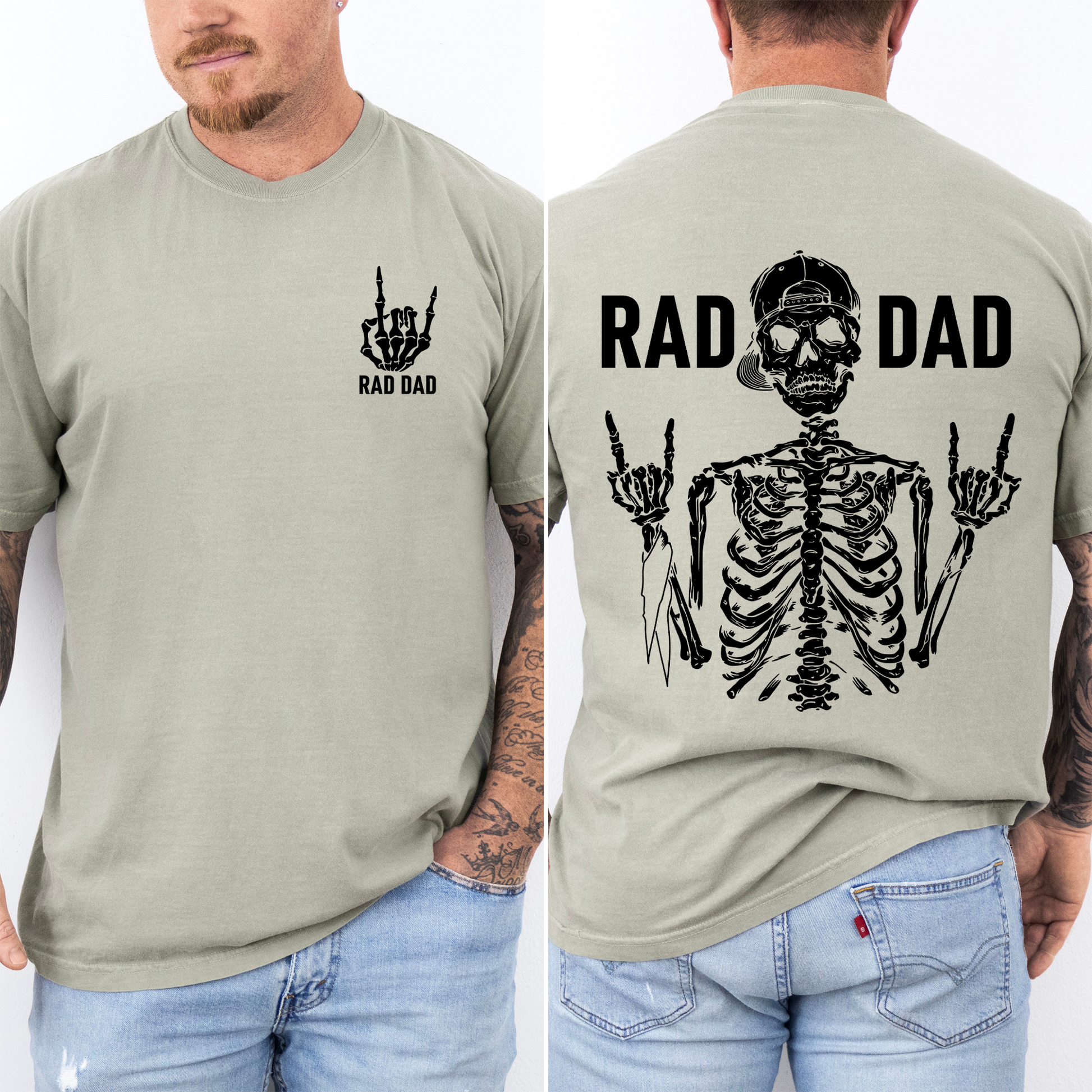 - Eye-Catching Skeleton Design: Featuring a striking skeleton graphic alongside the bold "Rad Dad" slogan, this tee allows you to showcase your unique style effortlessly.