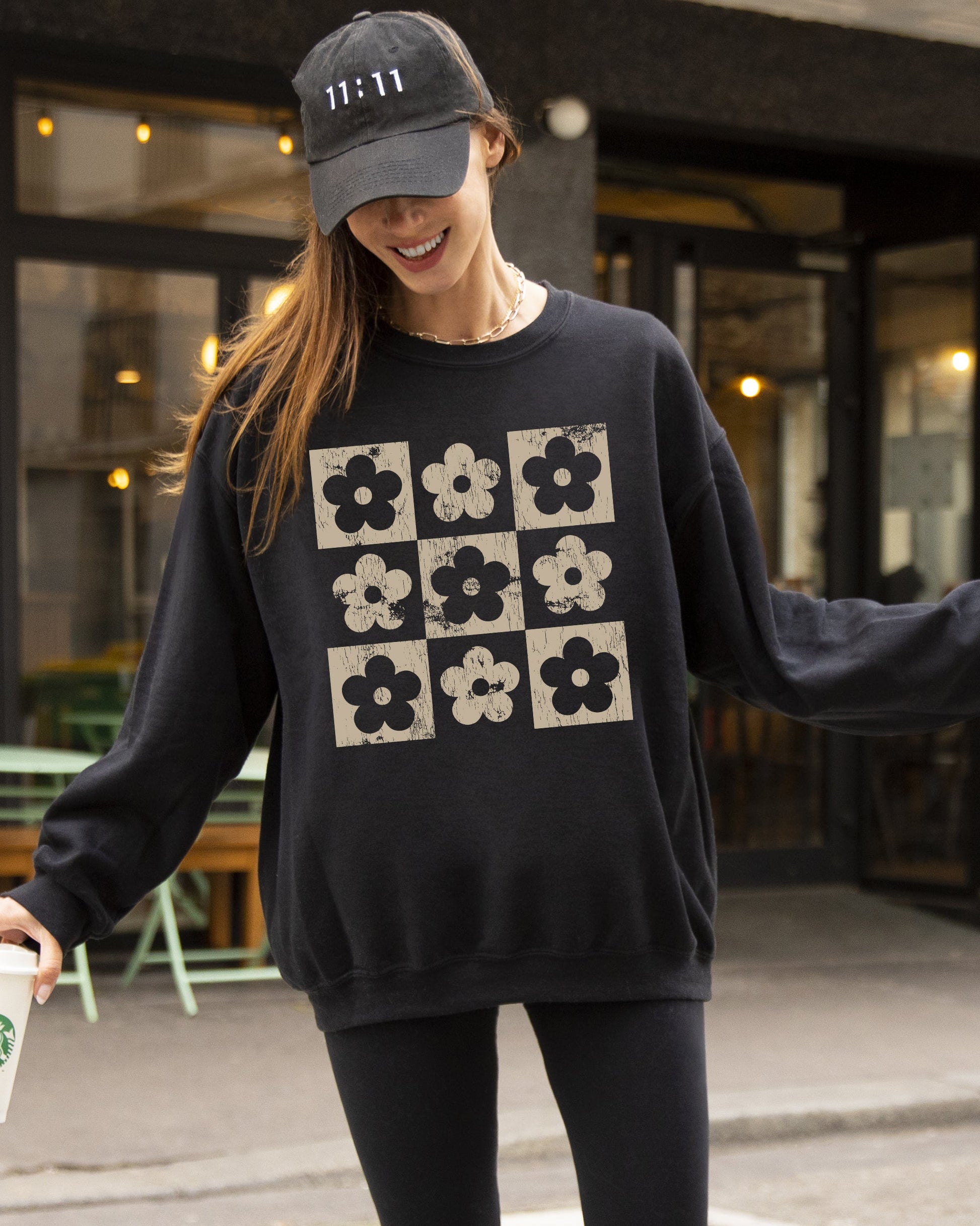 - Striking Graphic Designs: Featuring vibrant retro checkered flowers, this sweatshirt serves as a canvas for self-expression and style.