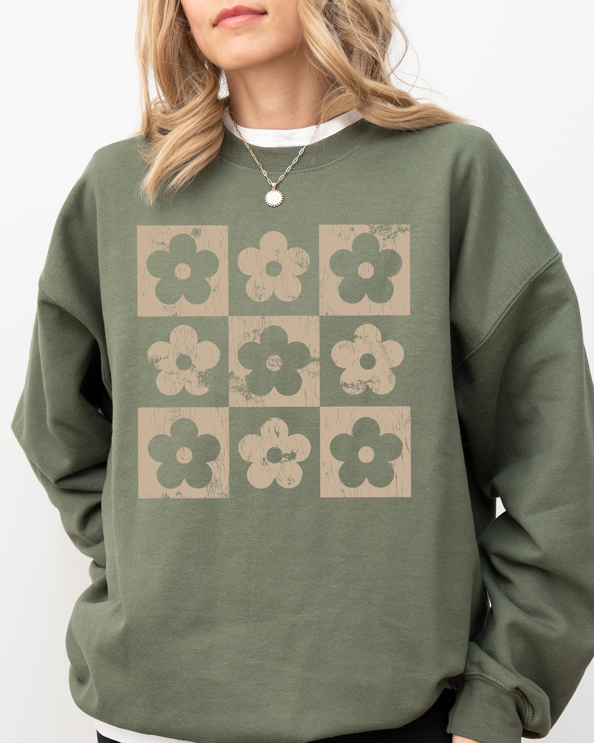 Introducing the Retro Checkered Flowers, Minimalist, Vintage Sweatshirt, where stylish design meets unparalleled comfort. This sweatshirt is an exceptional addition to any wardrobe, blending a unique retro aesthetic with a minimalist flair. Crafted from a durable cotton-polyester blend, it promises not only longevity but also a soft, brushed fleece interior that feels delightful against the skin.