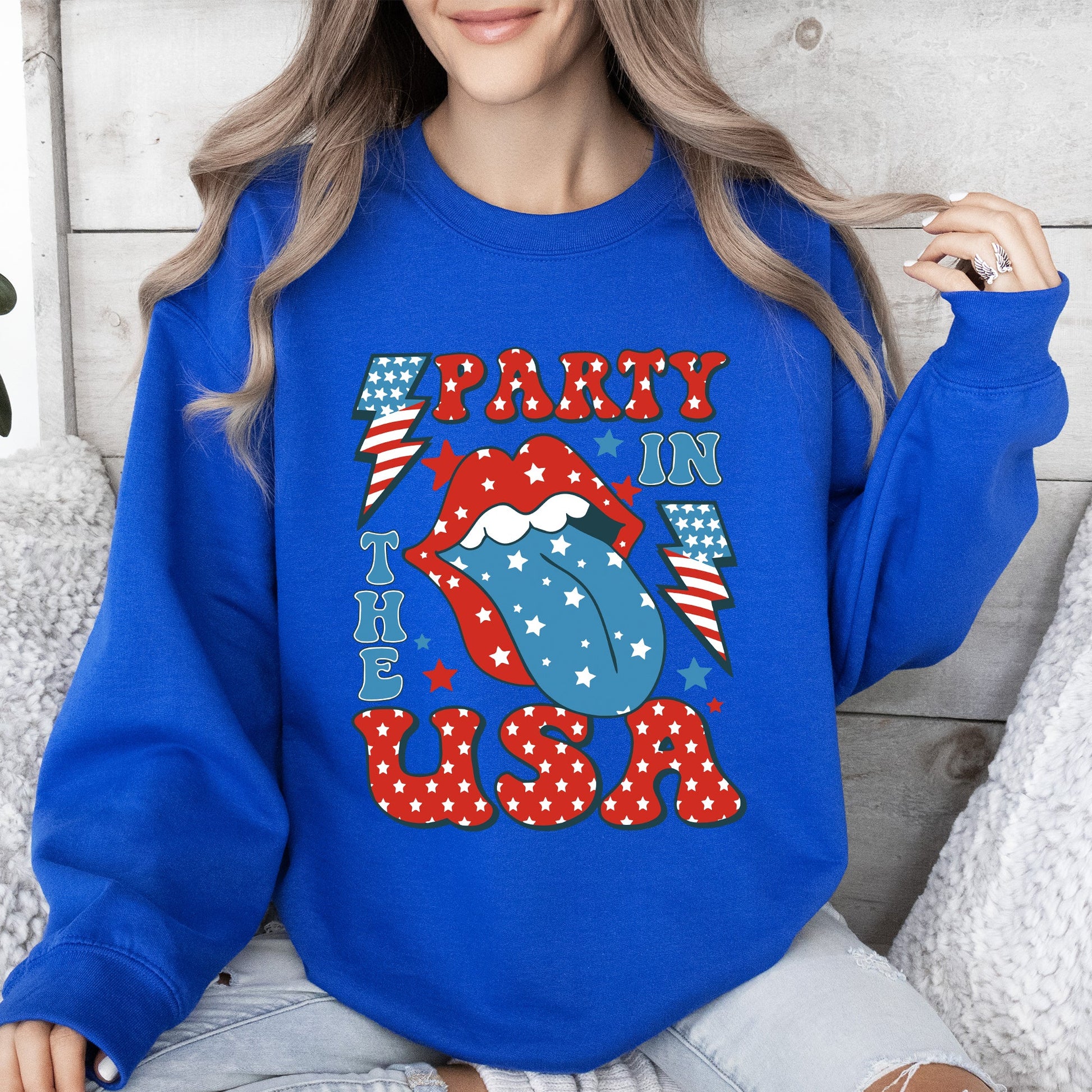 The Retro Party In The USA, Tongue 4th of July Sweatshirt pairs effortlessly with your favorite jeans for a relaxed yet trendy look. Layer it over a shirt to elevate your style, making it ideal for both casual gatherings and cozy nights in. Celebrate in style and comfort this 4th of July!
