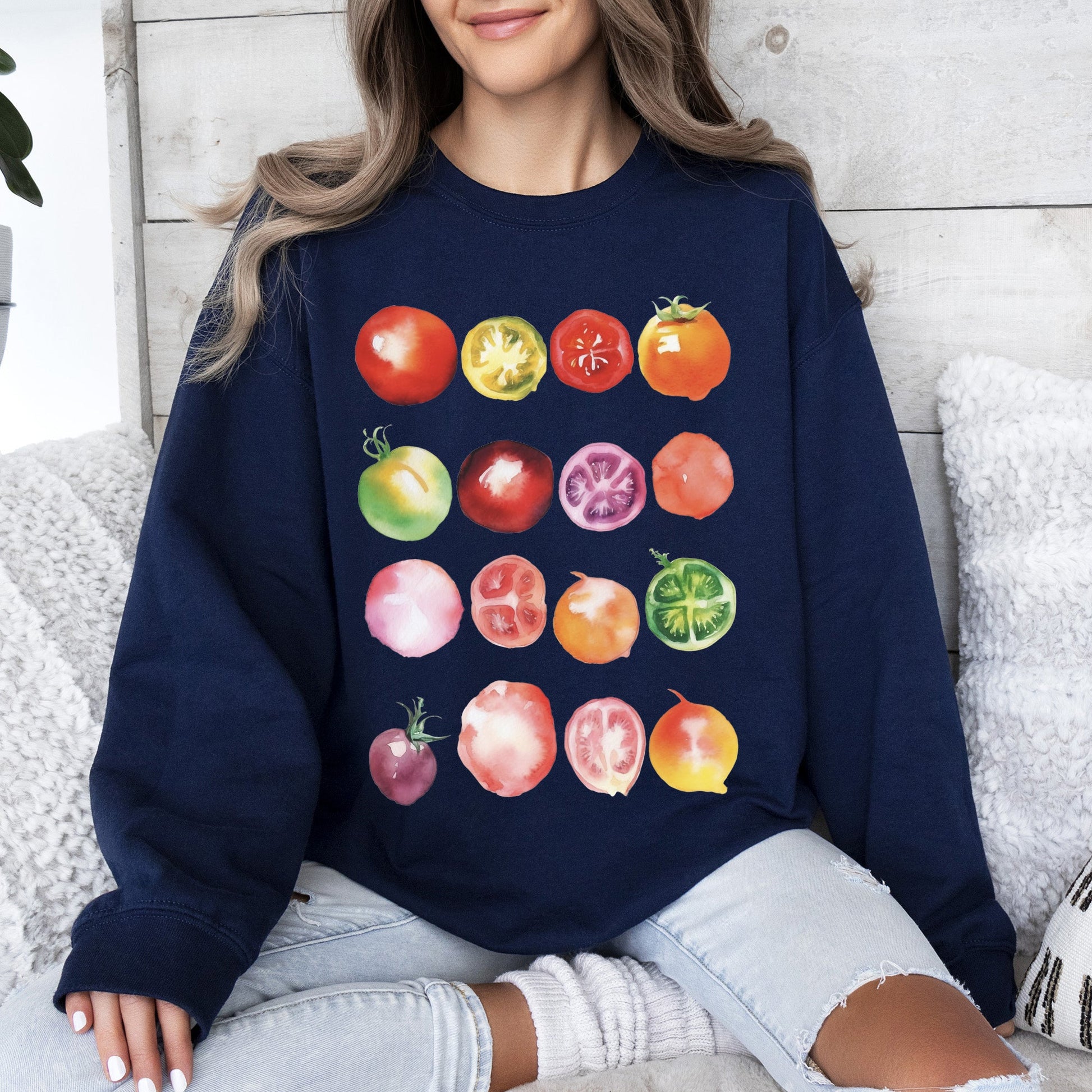 Pair your Ripe Tomato Print, Garden Fresh Sweatshirt with your favorite jeans for a relaxed and trendy outfit. Layer it over a shirt for a stylish, cozy look perfect for casual outings or cozy nights in. This sweatshirt is not just an article of clothing; it’s a statement of your passion for gardening and fresh produce!