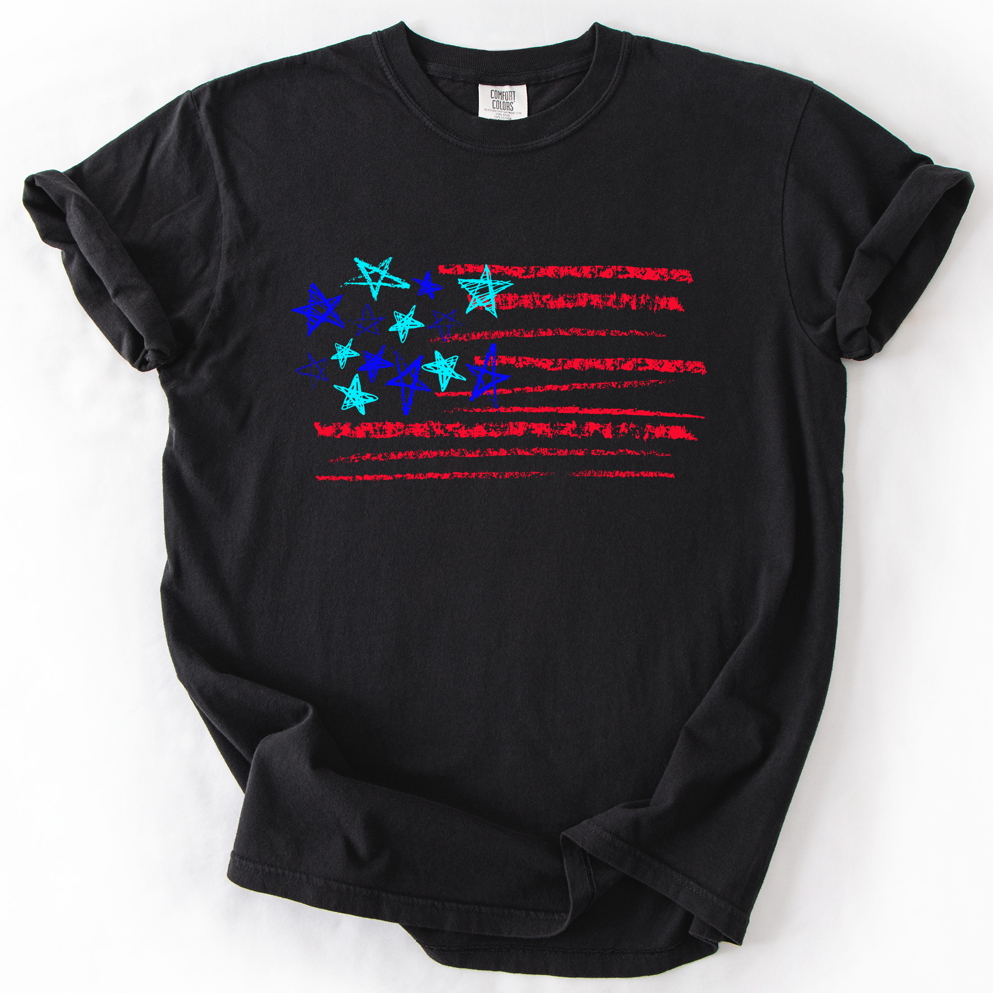 Don't miss out on the chance to showcase your American pride! Order your Sketched Flag, Fourth of July, America, Patriotic, USA, Comfort Colors T-Shirt today and celebrate in style with comfort and flair!