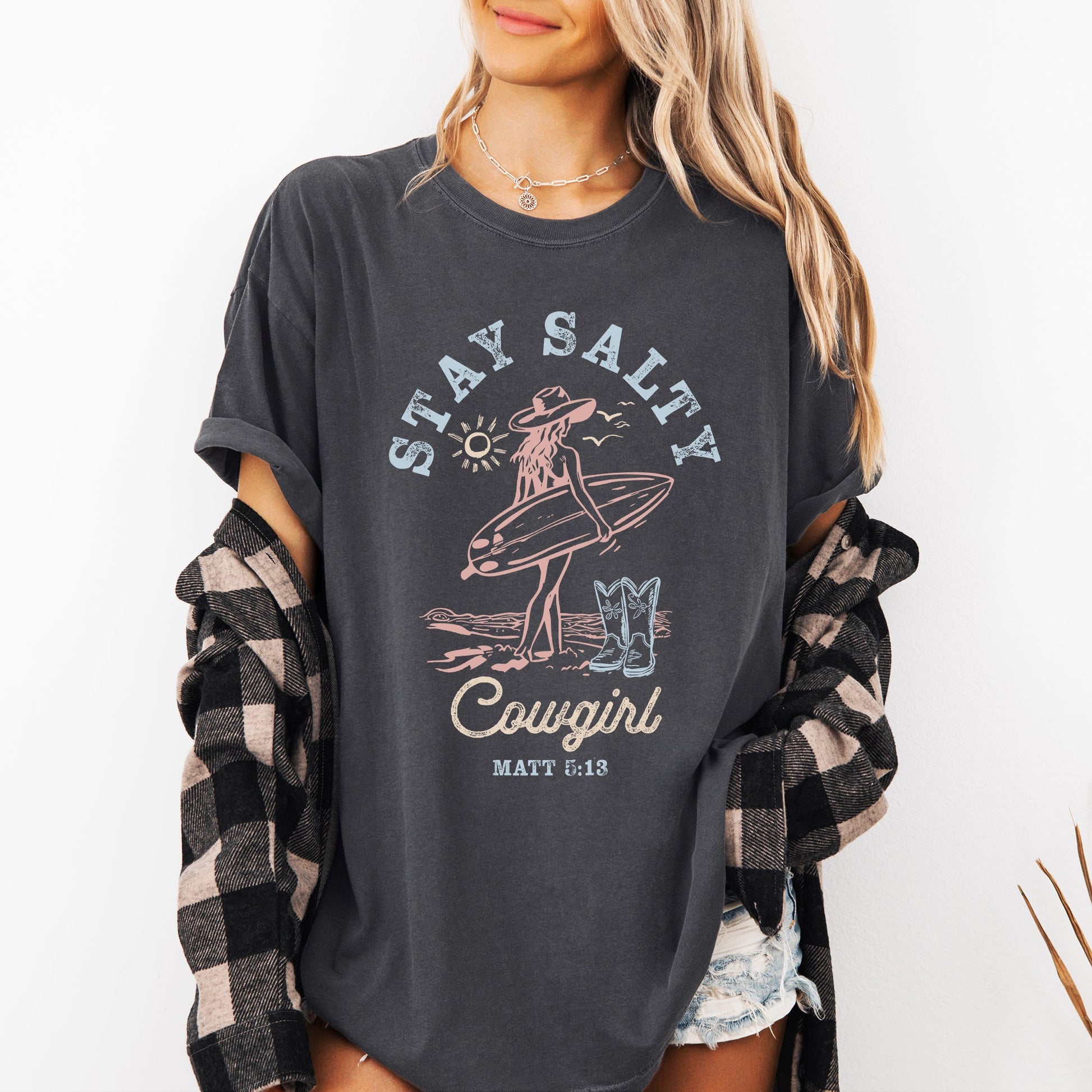 Embrace your inner cowgirl this summer with the Stay Salty Cowgirl T-Shirt from Comfort Colors. Designed for free spirits who love the beach, faith, and a touch of fun, this t-shirt is perfect for sunny days by the shore or casual outings with friends.