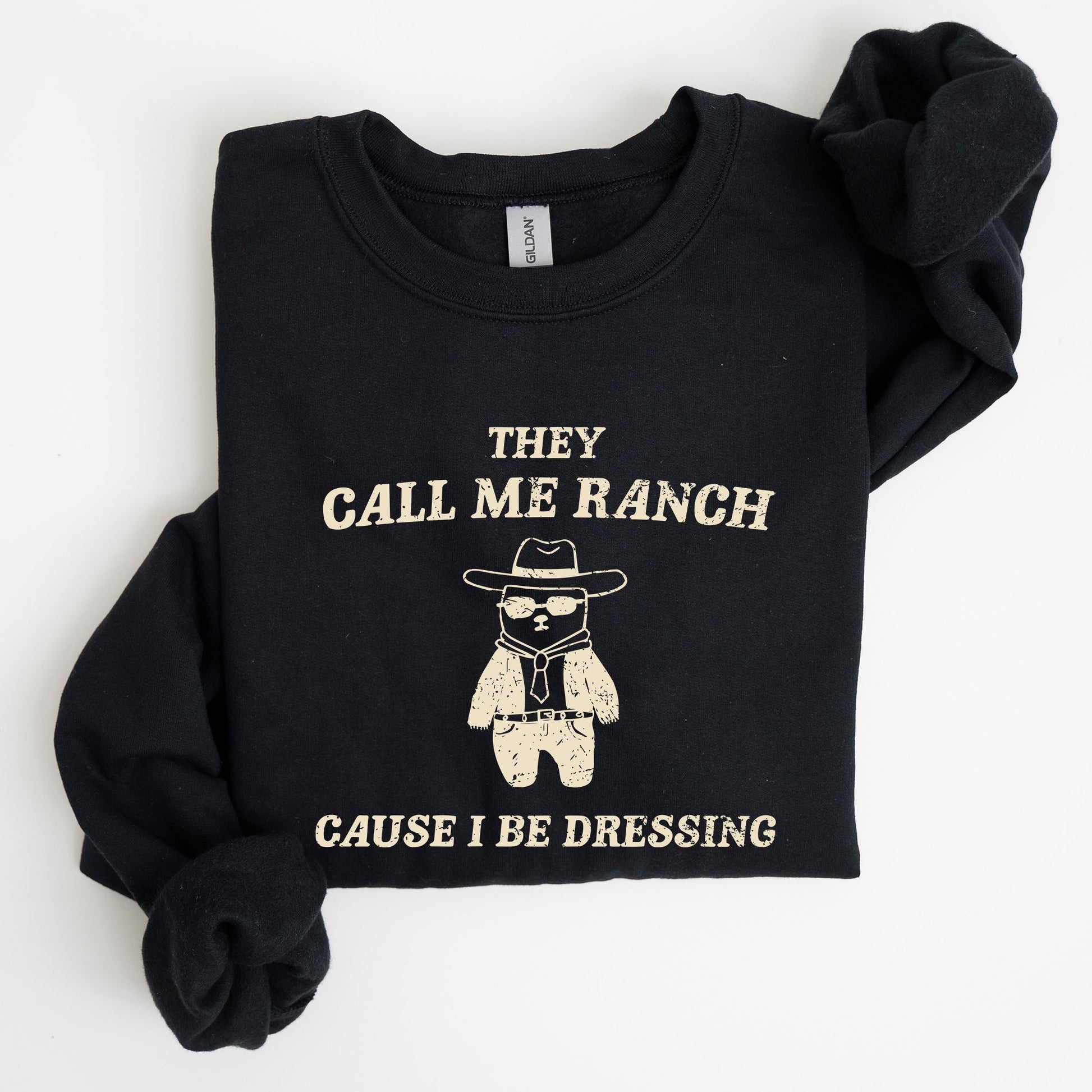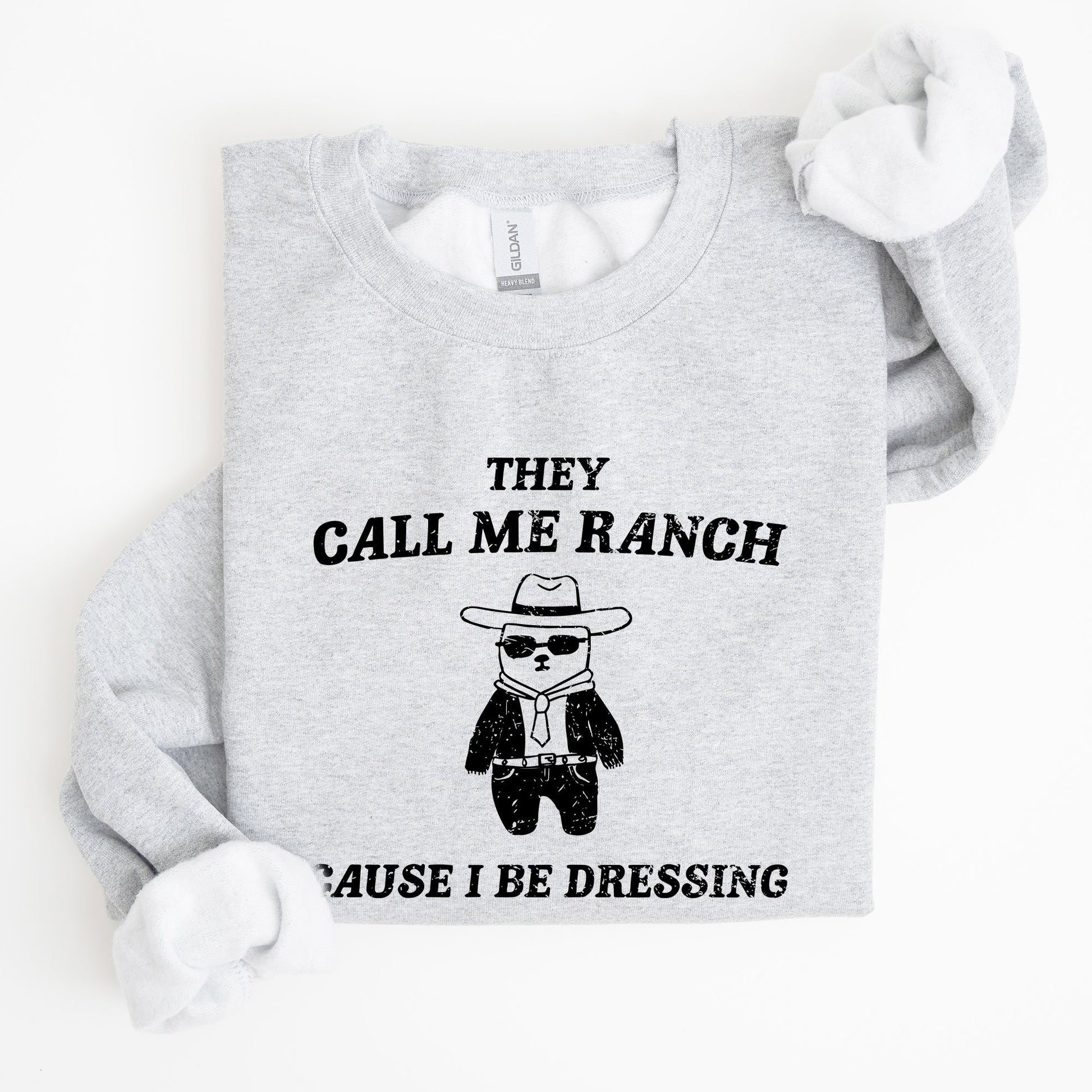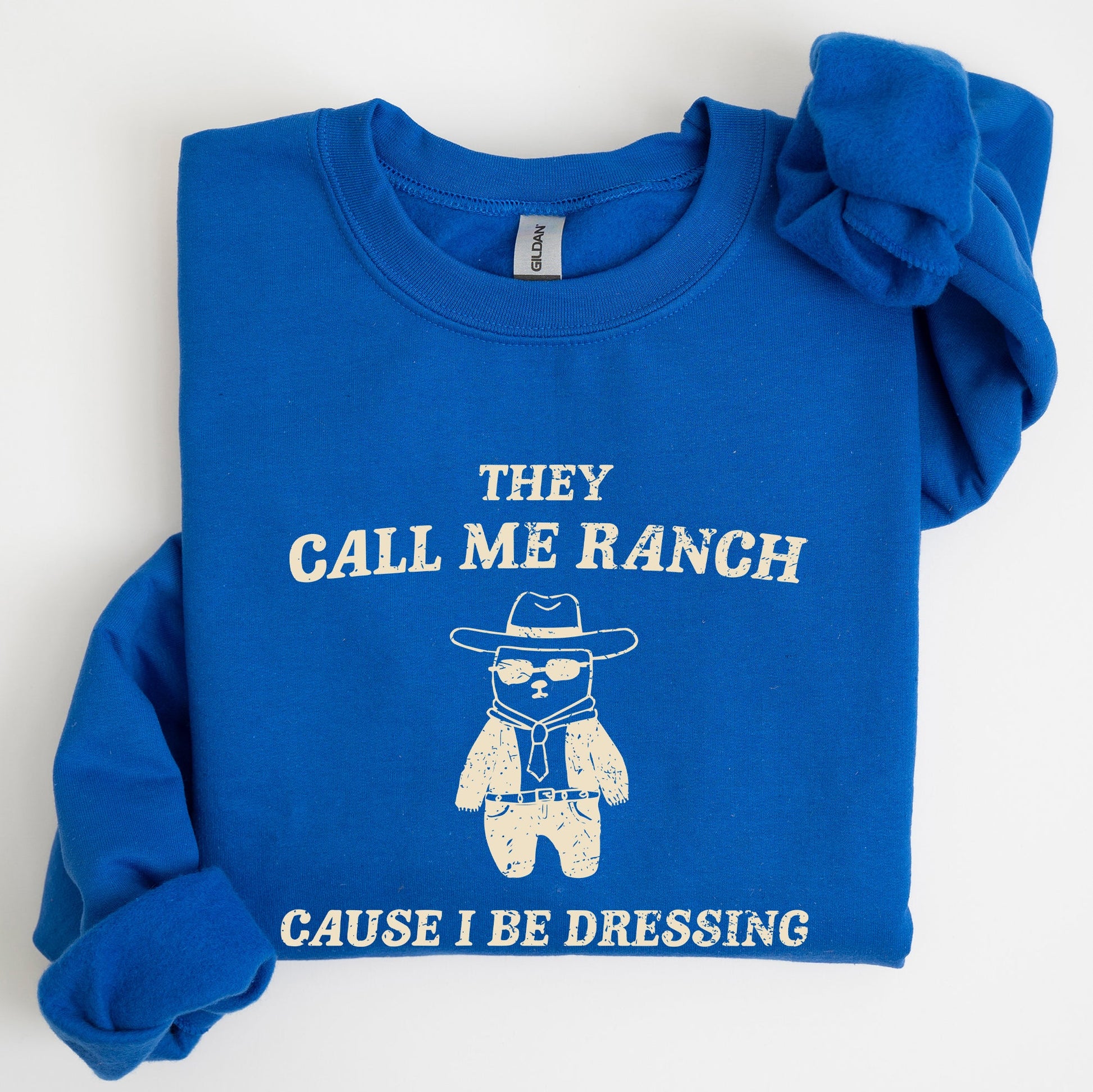 The They Call Me Ranch, Bear, Meme, Aesthetic, Funny Sweatshirt pairs effortlessly with jeans for a laid-back, trendy look. It can also be layered over shirts for added style, making it perfect for both casual outings and cozy nights in. Elevate your wardrobe with a sweatshirt that not only offers comfort but also a chance to express your playful side!