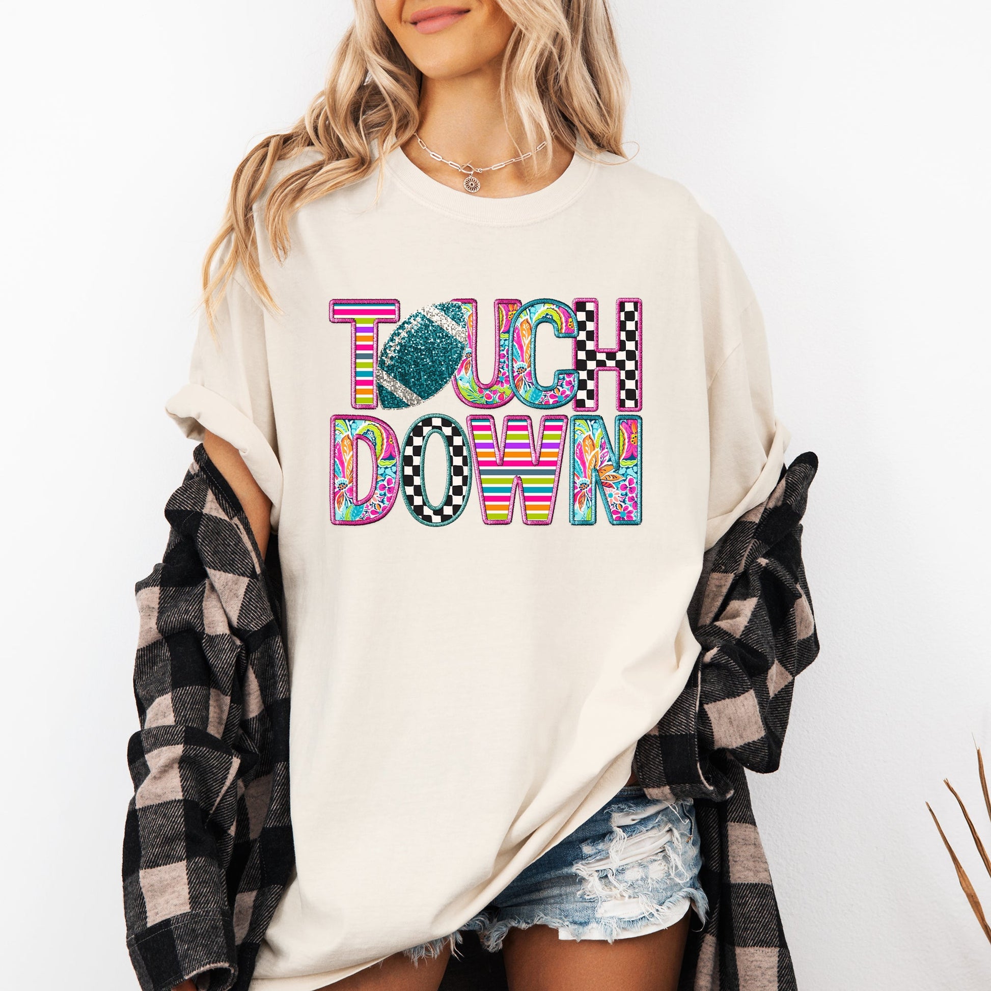 Touchdown, Faux Printed Embroidery Look, Colorful, Girly, Football, Sports, Game Day, Big Game, Tailgate Party Tshirt Comfort Colors T-Shirt