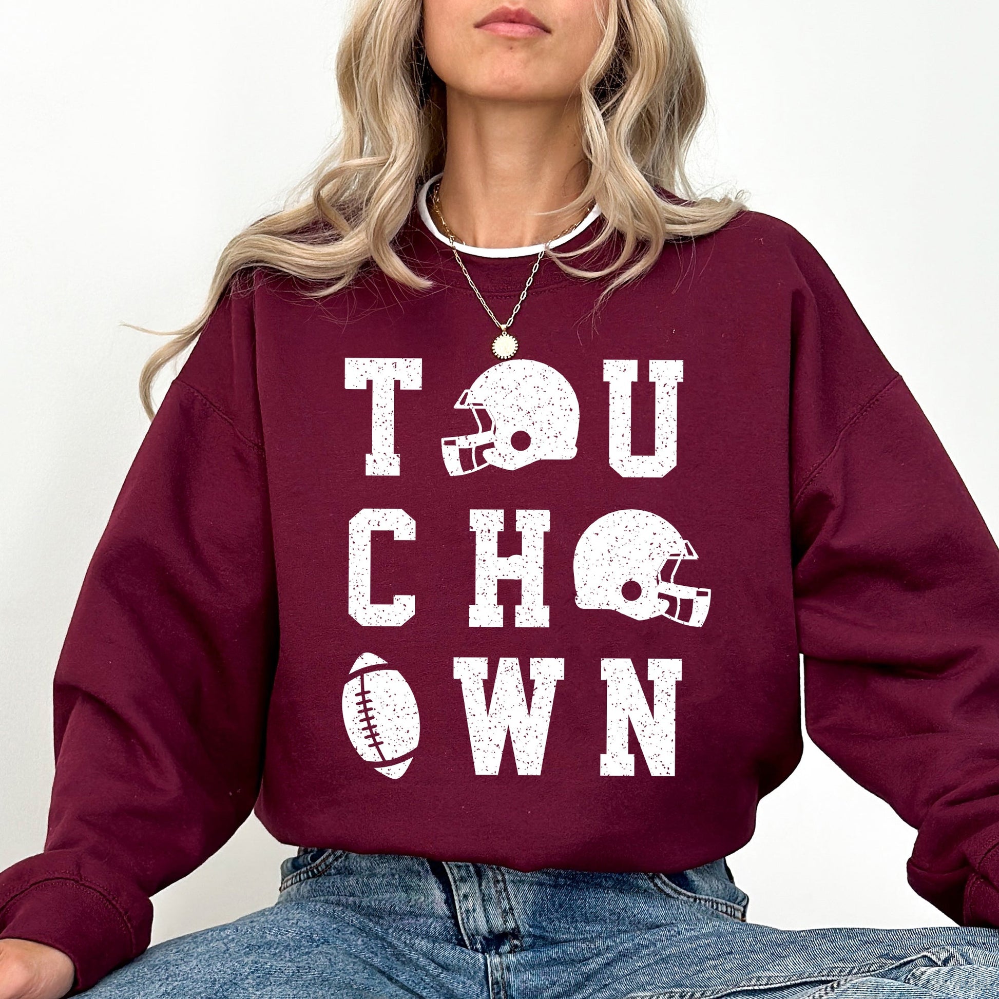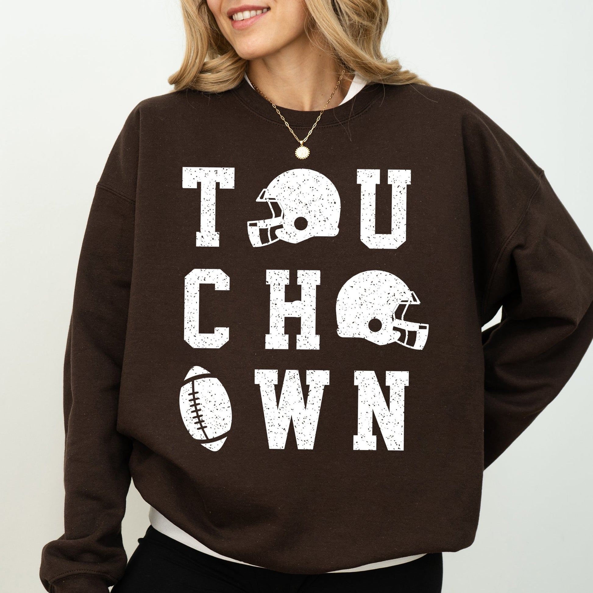 This Touchdown, Helmet, Football, Sports, Game Day, Big Game, Tailgate Party Sweatshirt pairs effortlessly with jeans or shorts for a laid-back yet trendy look. Layer it over your favorite shirt for added style, making it a versatile choice for both casual outings and cozy nights in.