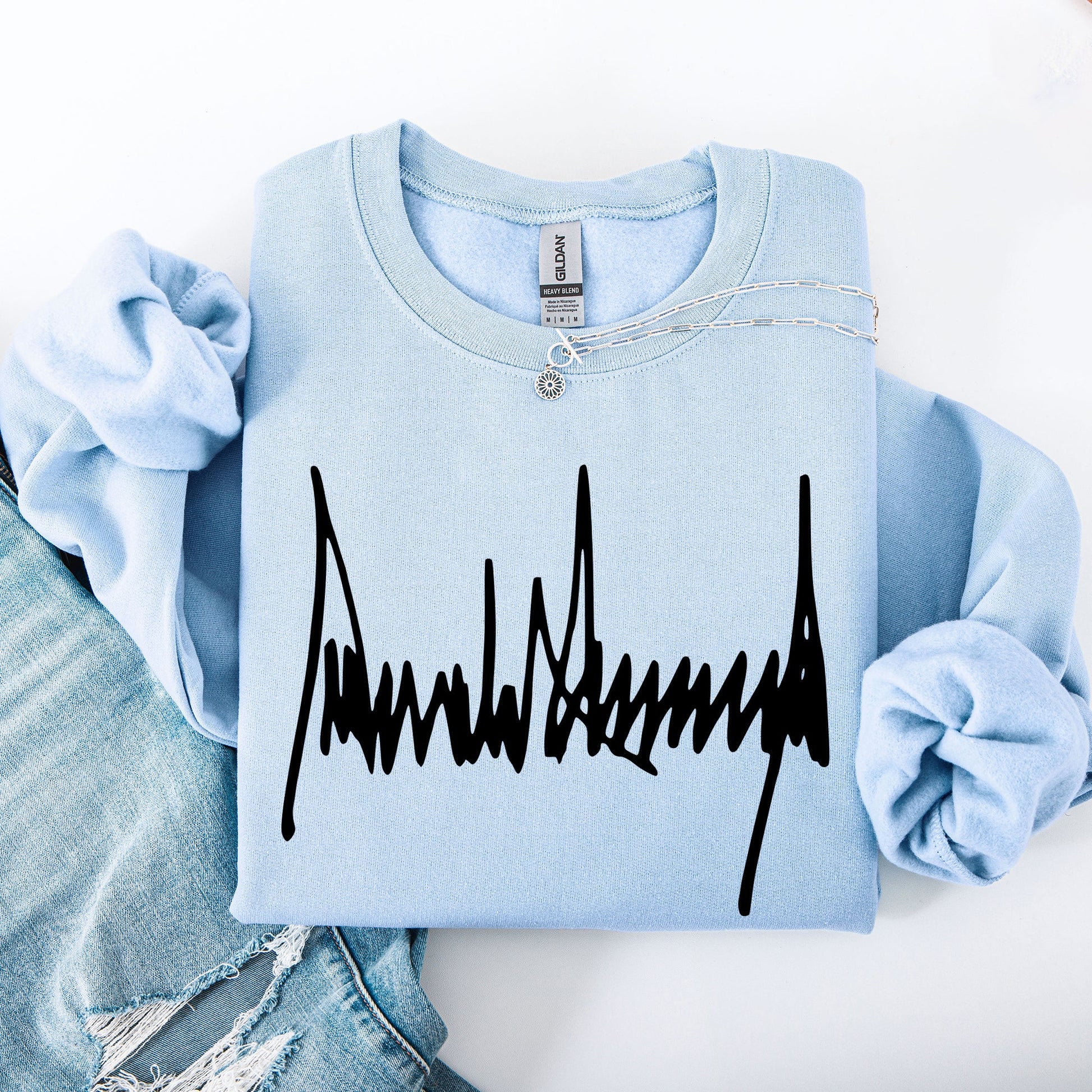 This Trump Signature, Patriotic, America, USA, 4th of July, Political Sweatshirt pairs perfectly with jeans for a relaxed and trendy look. Layer it over a t-shirt for added style, making it ideal for both casual outings and cozy nights in. Embrace your patriotic side and make a statement this 4th of July!