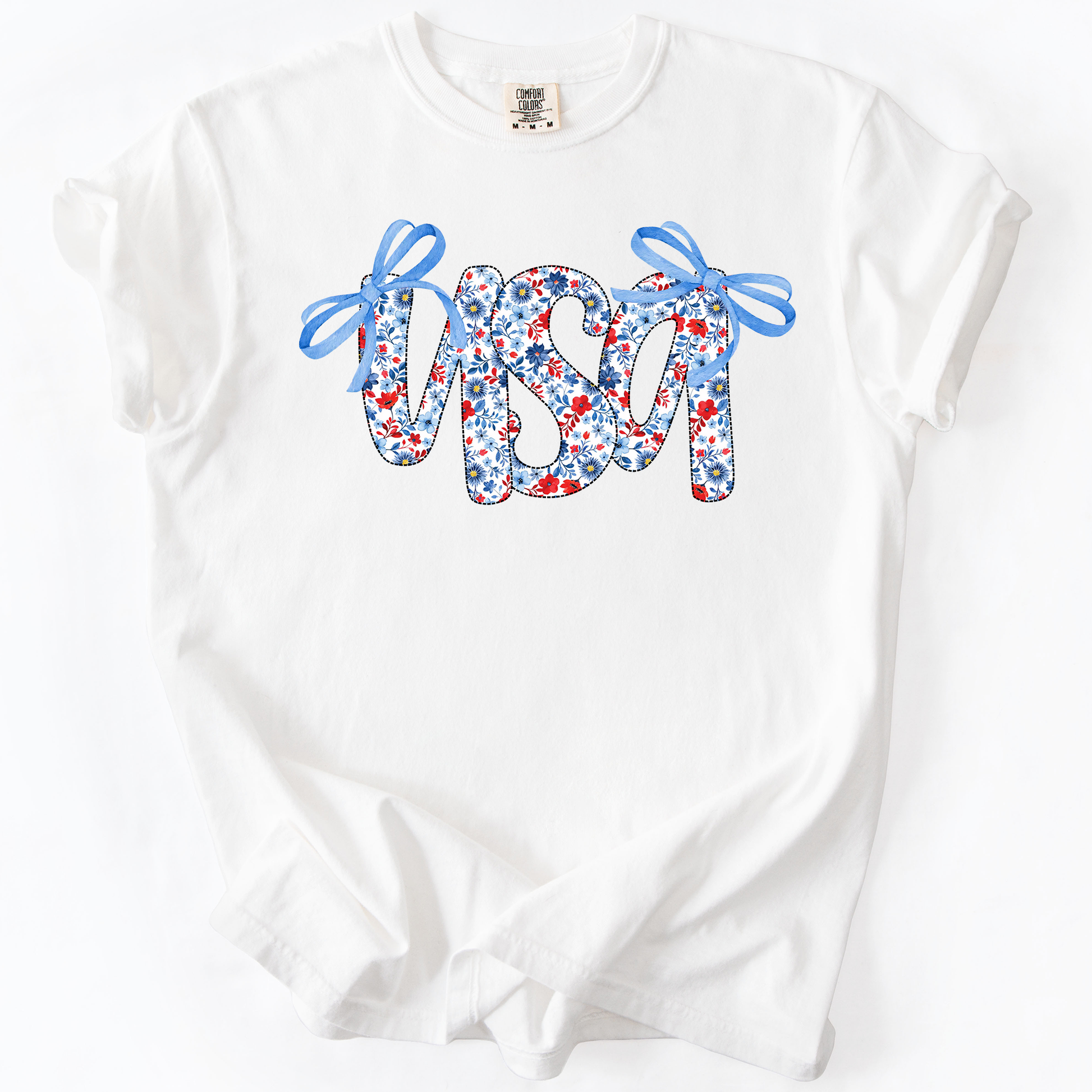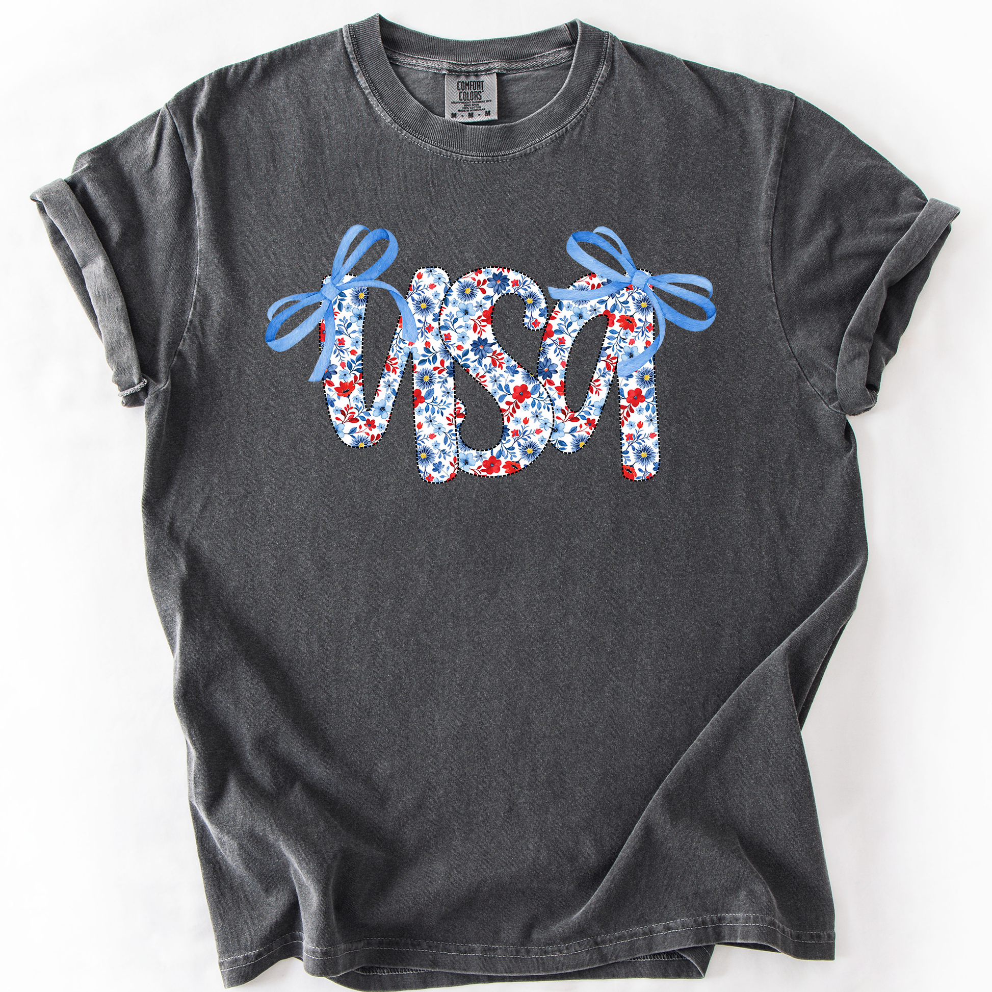 Celebrate your love for America in style with the USA, Patriotic Floral Patterns, Ribbons, Fourth of July, America, Comfort Colors T-Shirt. This t-shirt is more than just apparel; it is a vibrant expression of your patriotic spirit, perfect for any occasion!