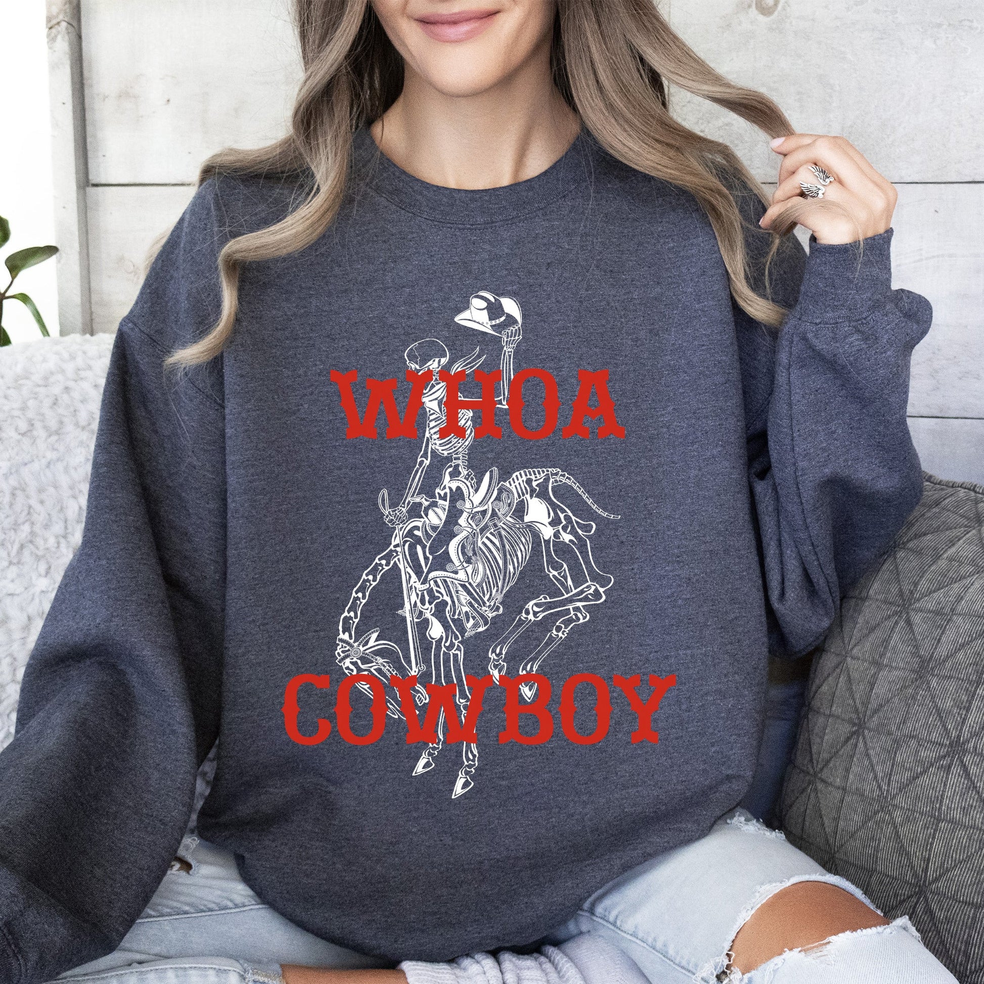 This Whoa Cowboy, Skeleton, Horse, Western Sweatshirt pairs perfectly with jeans for a relaxed yet trendy look. It's also great for layering over shirts, making it ideal for casual outings or cozy nights in. Make a bold statement and express your unique style with this must-have sweatshirt!