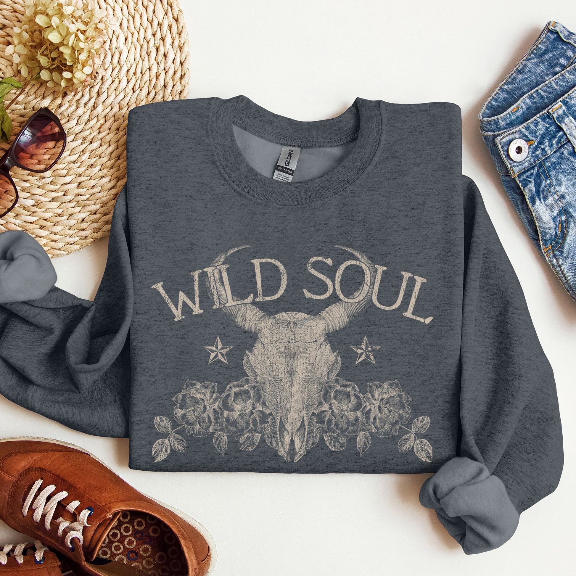Embrace your adventurous side with the Wild Soul, Cow Skull, Western, Desert Sweatshirt. This cozy yet stylish sweatshirt is designed for those who appreciate the rugged beauty of the West and the freedom of the great outdoors. Made for comfort, it features a soft fleece interior that feels amazing against your skin, making it perfect for chilly evenings or casual outings.