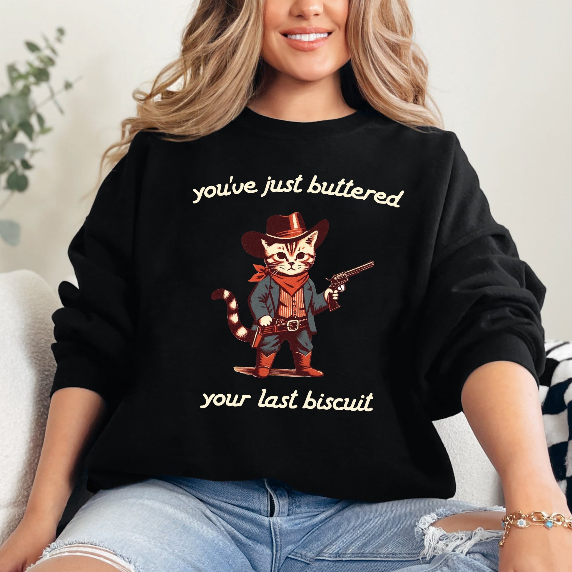 This You've Just Buttered Your Last Biscuit, Cat Cowboy, Cute, Western Sweatshirt pairs wonderfully with your favorite jeans for a laid-back yet trendy look. It can also be layered over shirts for added warmth and style, making it ideal for both casual outings and cozy nights in.